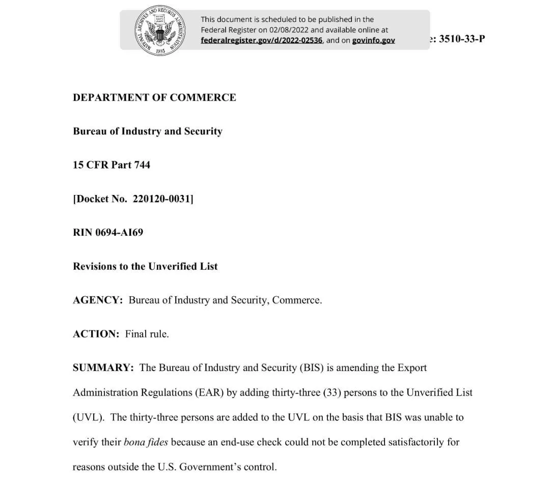 周一(2月7日),美国商务部表示,将33家中国实体列入“未经核实清单”(Unverified List,简称“UVL”),这是商务部出口管制清单的一种。