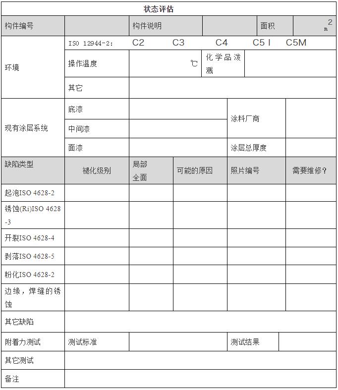 1、现场涂层质量状况的勘验:佐敦涂料将派出专业的、有经验的技术人员,依据ISO 12944和ISO 4628以及业主的涂装规格书、设计文件等,对客户现场的涂层进行专业的、多角度的勘验和评估,并进行详细的记录。表1为现场涂层质量状况的勘验评估表,该表将影响涂层质量的主要因素列出,便于评估涂层的实际质量状况。