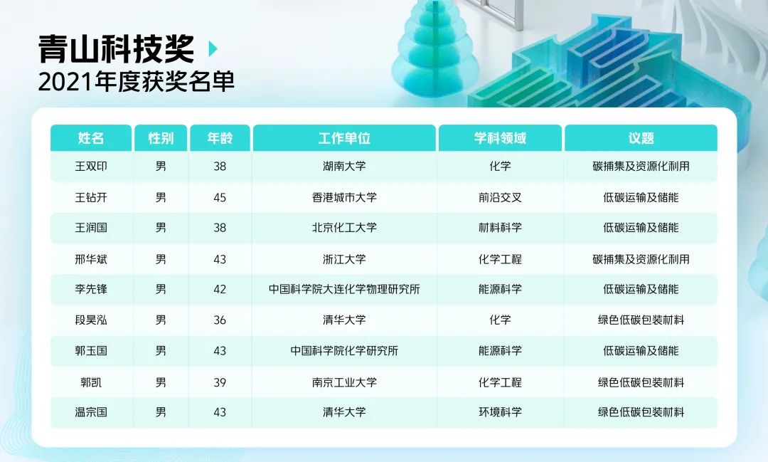 2021年度的青山科技奖将重点关注绿色低碳包装材料、碳捕集及资源化利用、低碳运输及储能三大议题,主要涉及材料科学、化学、化学工程、环境科学、能源科学以及前沿交叉六大学科领域。青山科技奖面向在中国内地及港澳地区全职工作的45周岁及以下青年科研工作者开放申报。