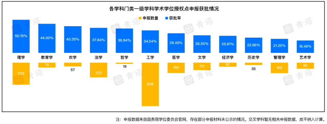 从学科门类来看,工学门类申报一级学科学术学位点数量最多,为658个;理学门类共申报333个,获批率为50.15%,是获批率最高的学科门类。