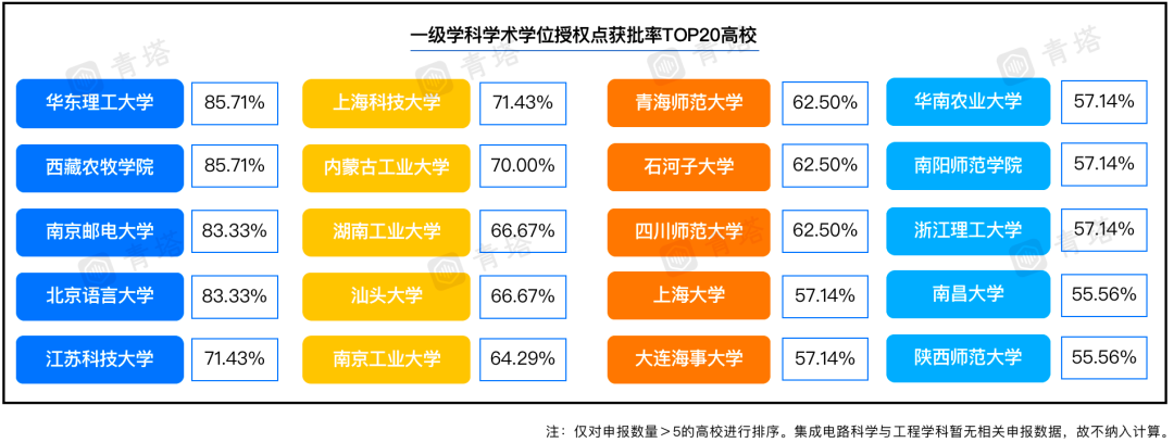 在全国获批率Top20高校中,行业类高校占约80%的席位,在保持自身优势学科的同时,这些高校也正在寻求多学科协调发展。其中,华东理工大学、西藏农牧学院获批率最高,为85.71%;其次是南京邮电大学和北京语言大学,获批率均为83.33%。