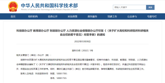 3月8日,科技部网站发布《〈关于扩大高校和科研院所科研相关自主权的若干意见〉问答手册》。