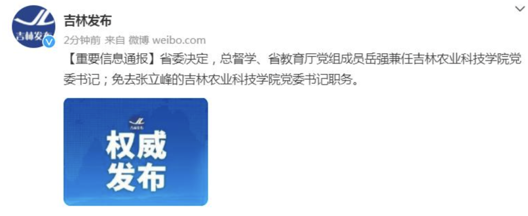 3月10日下午17:34,据@吉林发布,吉林省委决定,总督学、省教育厅党组成员岳强兼任吉林农业科技学院党委书记;免去张立峰的吉林农业科技学院党委书记职务。