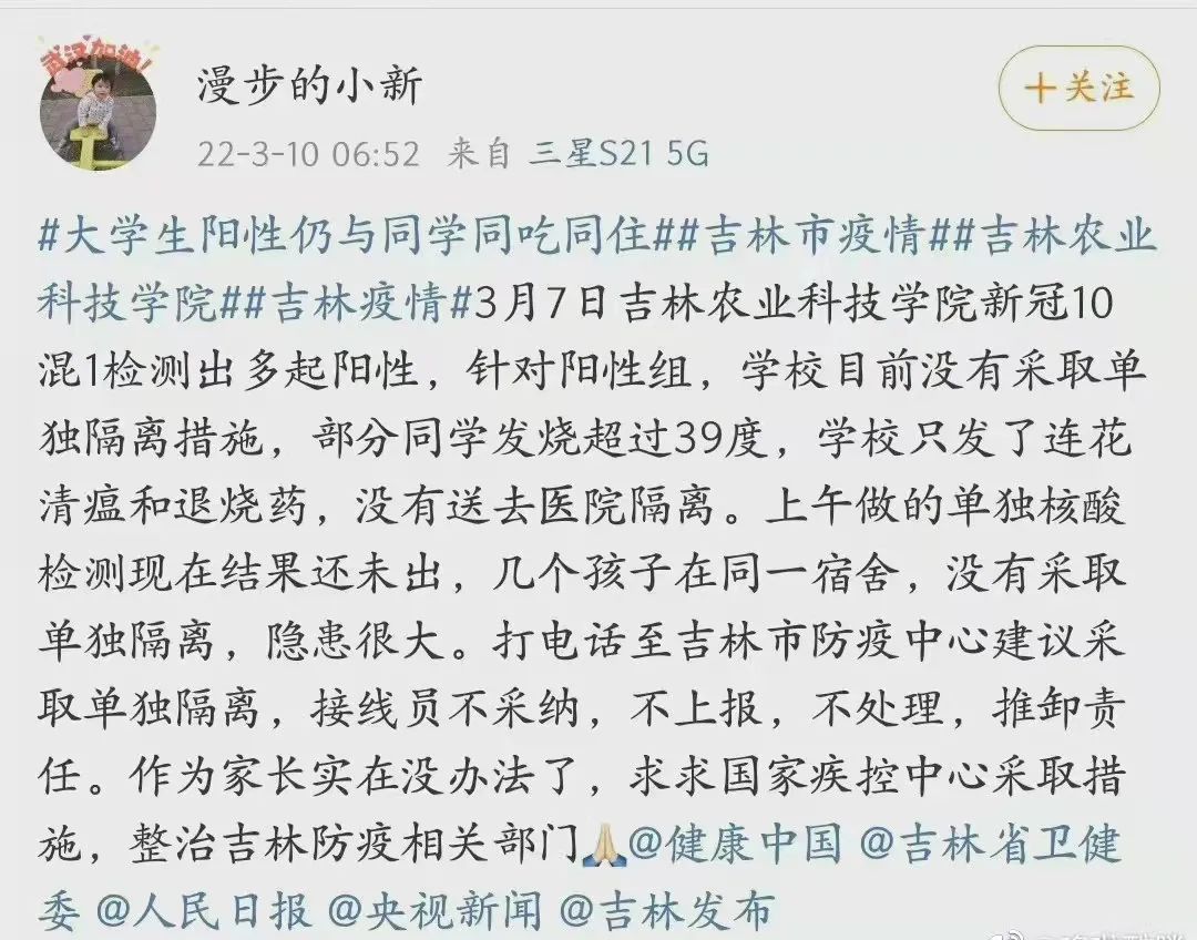 3月10日中午,一名自称吉林农业科技学院学生的微博网友@林凡一寻发布了一则长文,称该校疫情处置不力,校内疫情持续蔓延,学校却一直压微博热搜。学生所处环境恶劣,出现加叉感染;很多同学已心态崩溃,甚至有同学“已经没意识了,躺在寝室,等待处置”,迫不得已,所以发文求助。
