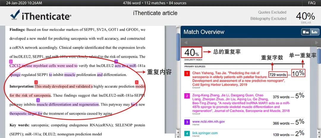 Crosscheck查重报告如上,重复的地方高亮,不同颜色代表不同来源,可以根据结果进行修改降重,一目了然。