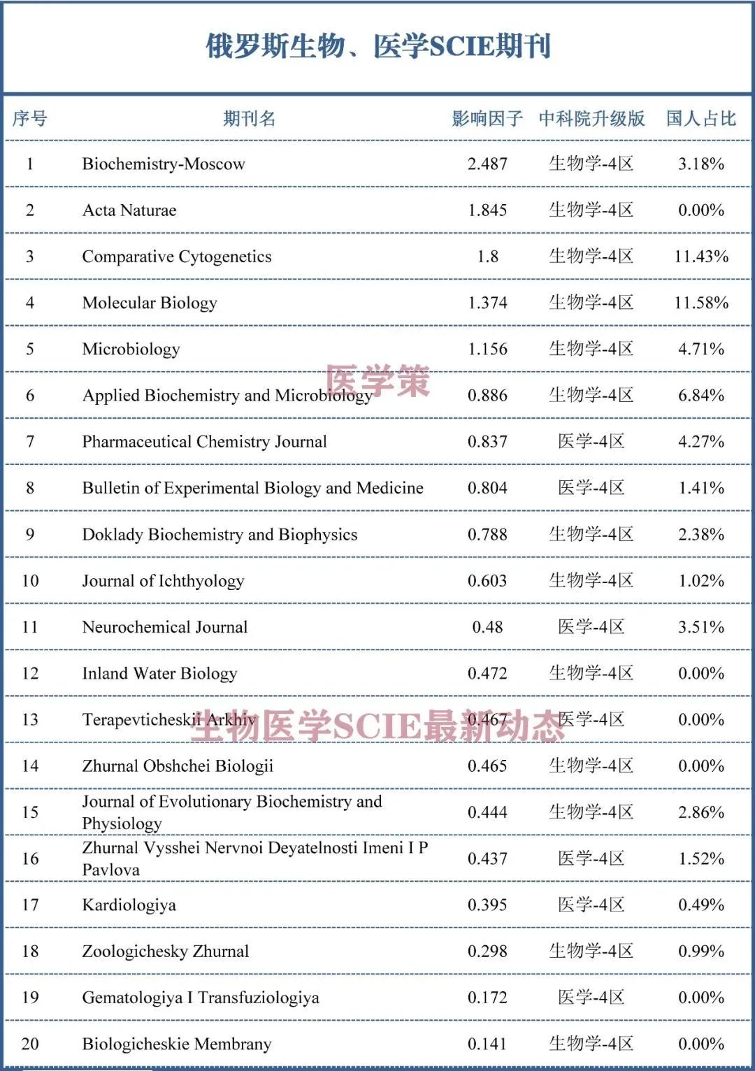 据初步统计,俄罗斯出版的生物医学领域的SCIE期刊共有20本,个别期刊国人占比达到了10%以上。
