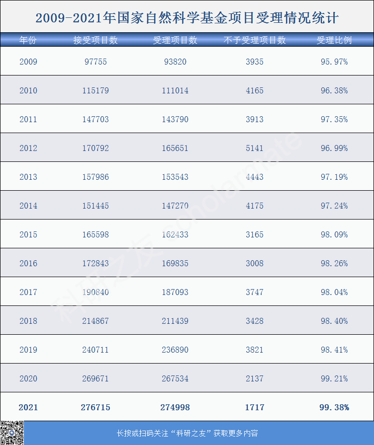 根据国家自然科学基金委官网报道,在2021年度项目申请集中接收期间共接收各类型项目276715项。经初审,自然科学基金委共受理项目申请274998项,不予受理项目申请1717项。从统计结果来看,2021年受理比例高达99.38%,再创新高。