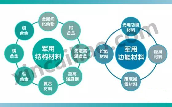 军用新材料按其用途可分为结构材料和功能材料两大类,主要应用于航空工业、航天工业、兵器工业和船舰工业中。