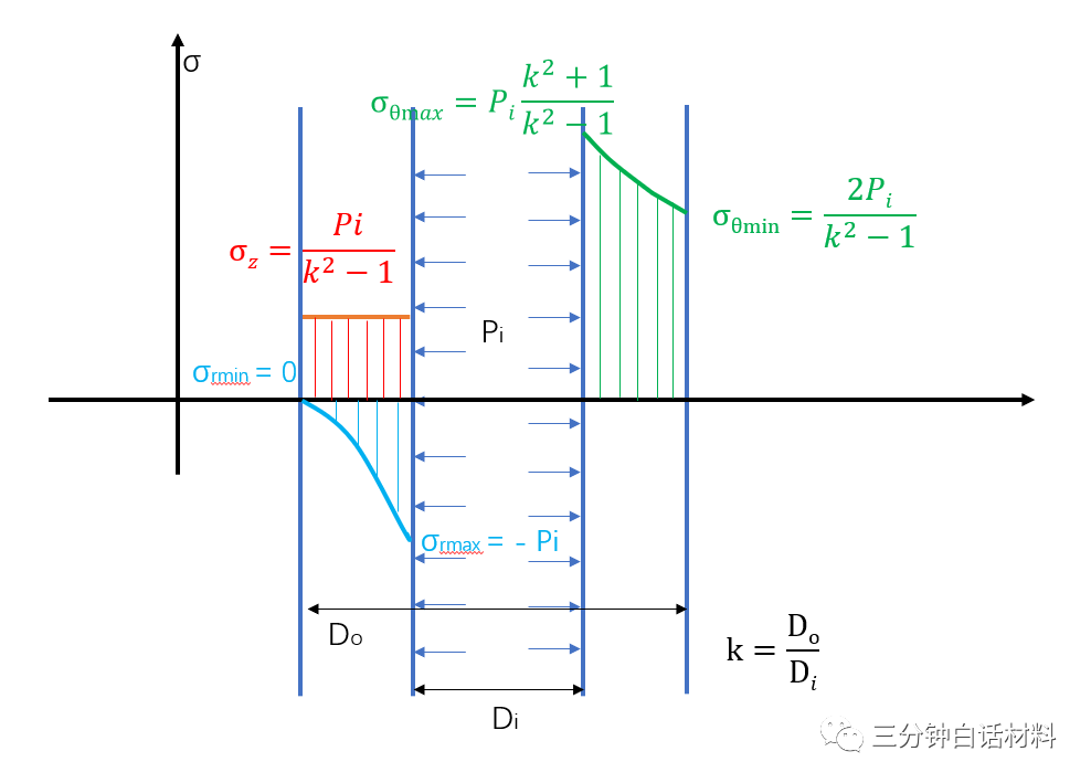 周向应力σθ 及轴向应力σz均为拉应力(正值),径向应力σr为压应力(负值)。周向应力σθ 在内壁处最大,外壁处最小。径向应力内壁处为-Pi,随着r增加,径向应力绝对值逐渐减小,在外壁处σr=0;轴向应力σz为一常量,沿壁厚均匀分布。我们可以看出内壁处的径向应力,及周向应力都是最大的,耐轴向应力为常值,所以可以得出内壁处的等效应力肯定也是最大的,等效应力是材料力学中将三个方向的正应力和切应力折算成一个等效应力,再用这一个等效应力按材料强度选择材料。