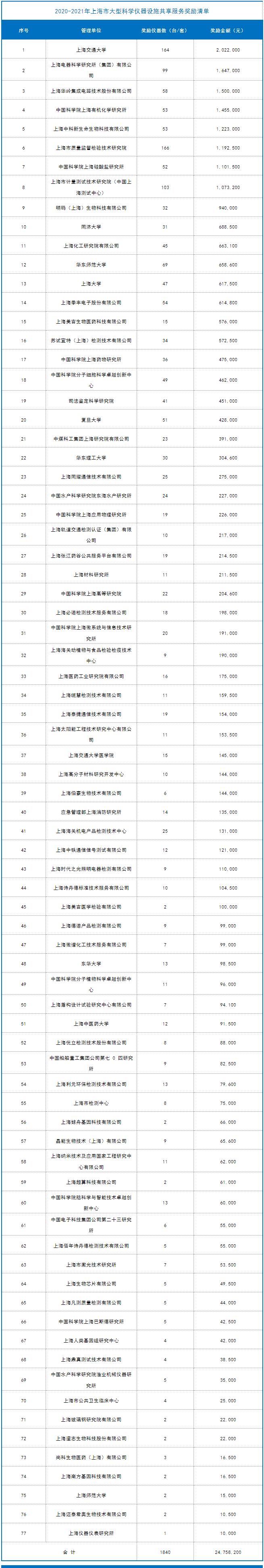 为鼓励和支持本市大型科学仪器设施共享服务,根据《上海市大型科学仪器设施共享服务评估与奖励办法》,我委组织开展了2020-2021年上海市大型科学仪器设施共享服务评估与奖励工作,按照《上海市大型科学仪器设施共享服务评估与奖励办法实施细则》进行了评估。经审定,对上海交通大学等77家服务单位发放奖励资金共2475.82万元,对王思怿等24名先进个人发放奖励资金共4.8万元,授予上海交通大学等9家单位为先进集体。请各单位接通知后,做好奖励资金的实施与监管工作。