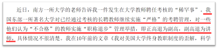 不久前,一位高校教授在科学网的博文中写道:我国东部一所著名大学对已经通过考核的长聘教师继续实施“严格”的考聘管理,对一些他们认为“不合格”的教师实施“职称退步”管理举措,即正高退为副高,副高退为讲师。