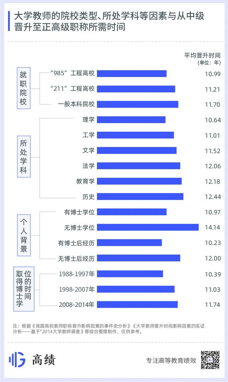 此前多份调查报告显示,从中级职称(讲师)晋升至正高级职称(教授)的平均晋升时间至少在10年以上。而顺利晋升的只是少数“幸运儿”,更多的还是未顺利晋升的讲师和副教授们,他们所花费的时间可能不仅仅是十余年,甚至有二十年、三十年。