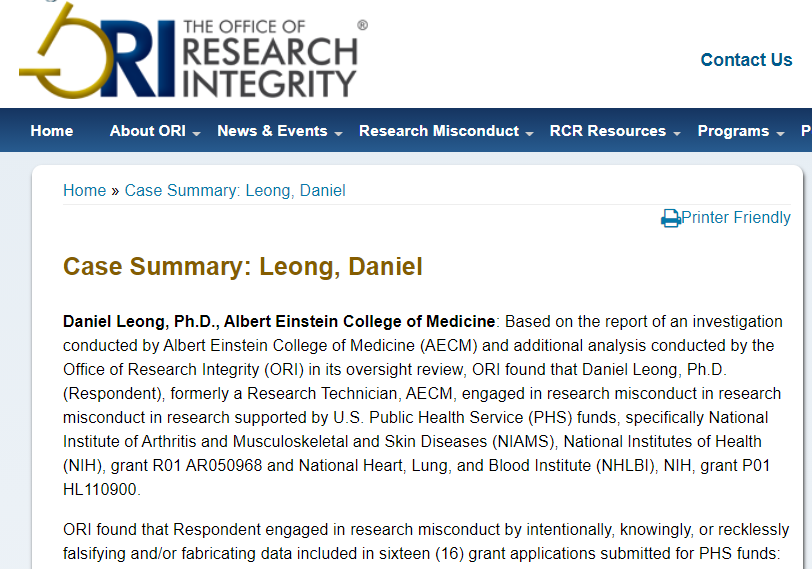 ORI 发现,Leong Daniel通过有意、故意或鲁莽地伪造和/或捏造包含在为 PHS 基金提交的十六 (16) 份基金申请中的数据(50个)而从事研究不端行为。在缺乏可靠的图像数据的情况下,据称源自这些图像的相关图表中的数字、定量数据、统计分析和相关文本也是错误的。