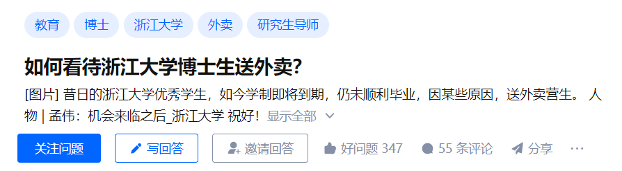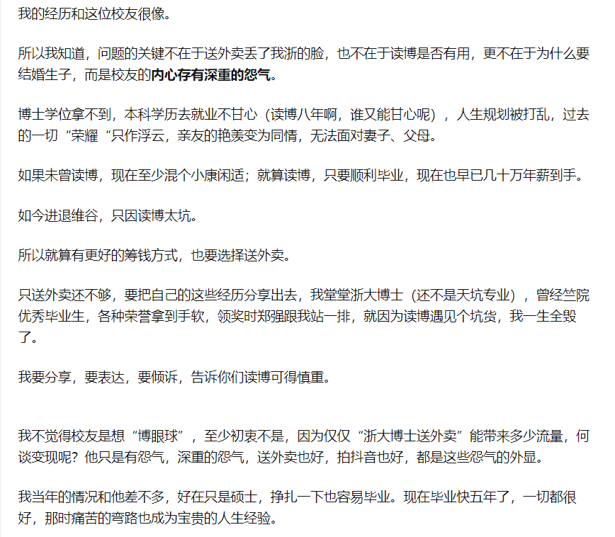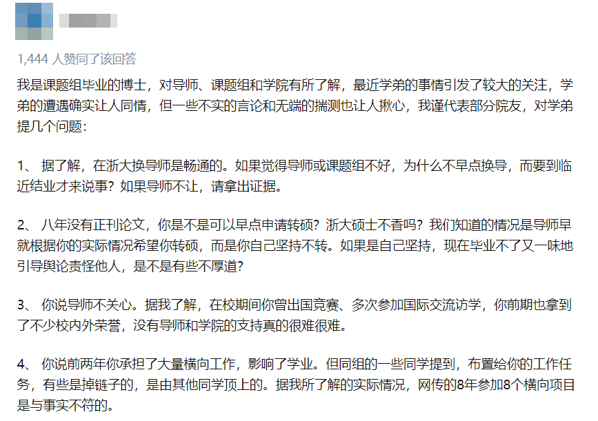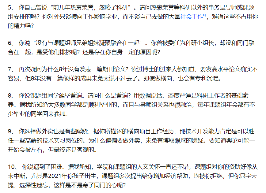 他在自己的抖音号上写了这样一句话“人多时聊聊读博8年黑经历,谨供后来者避雷”。此事先在浙大的校内论坛cc98中引发讨论后被人搬了出来。当然针对他说的自己读博是黑经历,在知乎上有自称是他同实验室的学姐对此事进行了这样的回应: