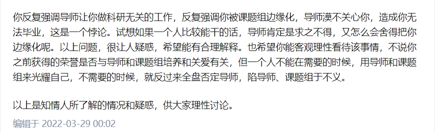 从编辑记录可以知道原答主应该的确是说了:“你说课题组同学延毕普遍,为什么其他课题组同学就算延期一两年也能毕业。”