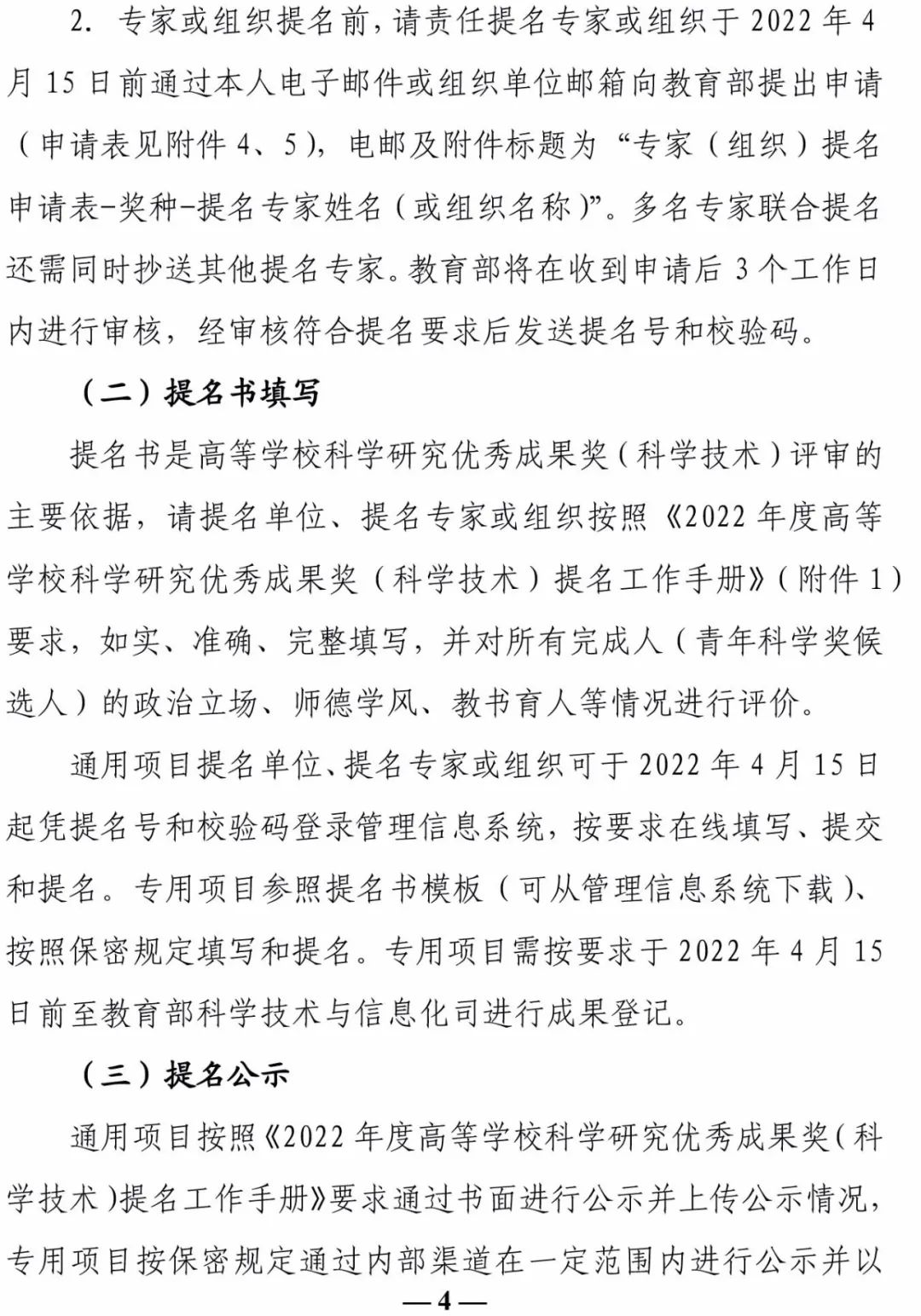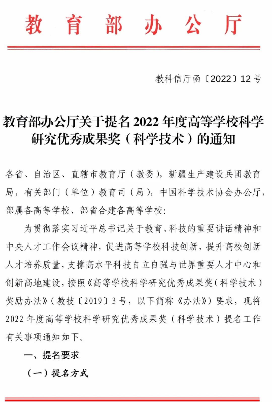 近日,2022年度高等学校科学研究优秀成果奖(科学技术)提名已启动。2022年高等学校科学研究优秀成果奖(科学技术)分为自然科学奖、技术发明奖、科学技术进步奖、青年科学奖4个奖种。前三类可通过学校直接提名,名额不限;也可通过专家进行提名。青年科学奖由专家或组织提名。