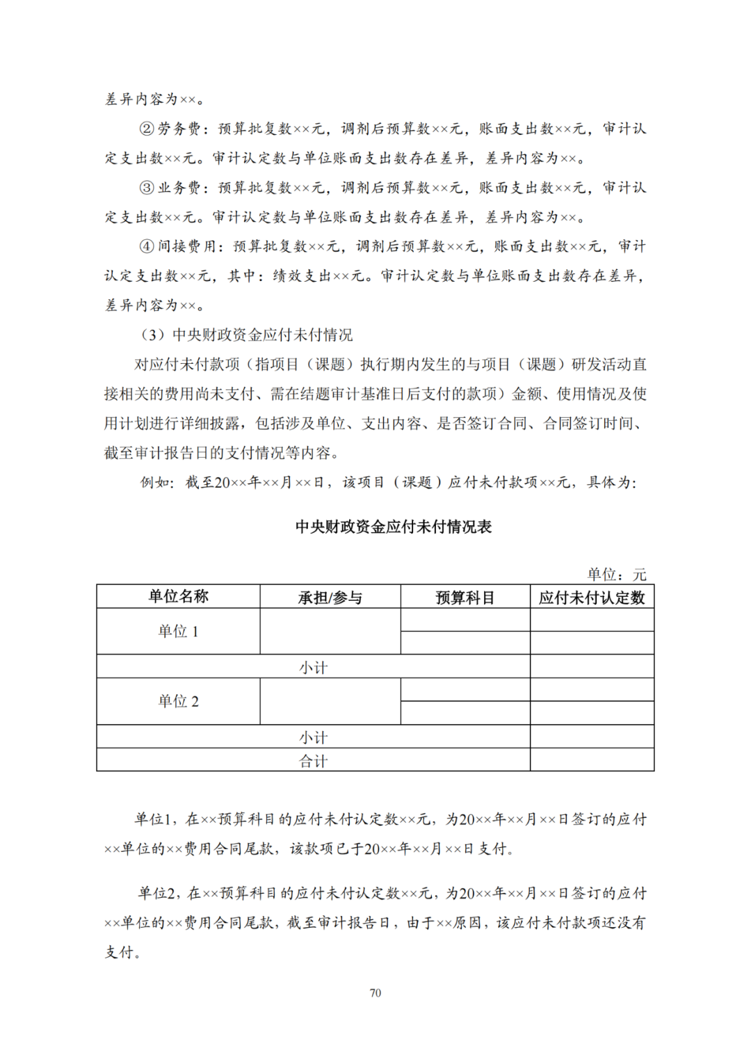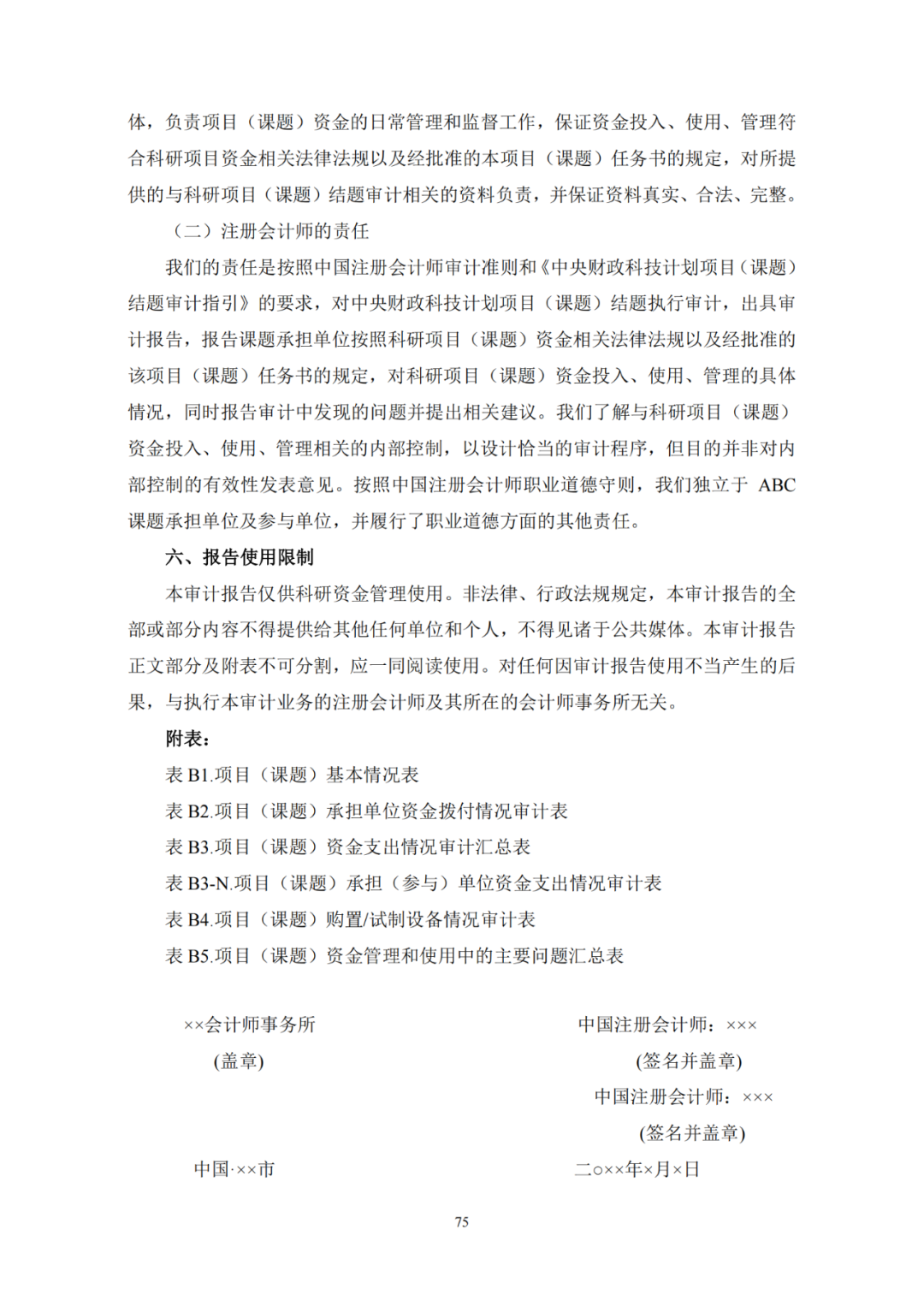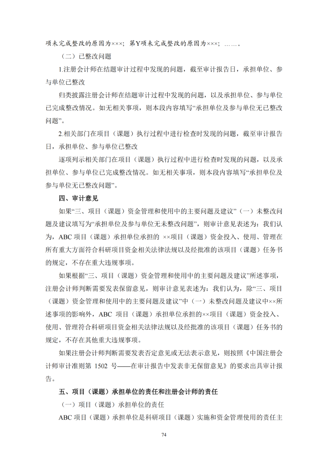 1. 优化了审计报告的正文结构和内容。征求意见稿在“引言段”新增了披露审计工作起始日、审计方式、实施的主要审计程序等信息的要求;在“课题基本情况段”中简化了已在相关技术报告或项目(课题)任务书中披露的内容,如项目(课题)承担单位介绍、课题研究内容等;在“资金管理和使用情况段”要求按照预算安排及调剂情况、资金到位和拨付情况、项目(课题)资金财务核算和资金使用情况分别进行报告,充分体现放宽预算管理权限和落实法人主体责任的政策,对于单位和负责人有权调剂预算的,不需要逐笔详细披露,但要求详细披露存在的问题;在“资金管理和使用中的主要问题及建议段”中要求披露相关部门在项目(课题)执行过程中进行检查时发现的问题、注册会计师在结题审计过程中发现的问题,以及问题是否已整改;简化了有关项目(课题)承担单位的责任和注册会计师的责任的表述。