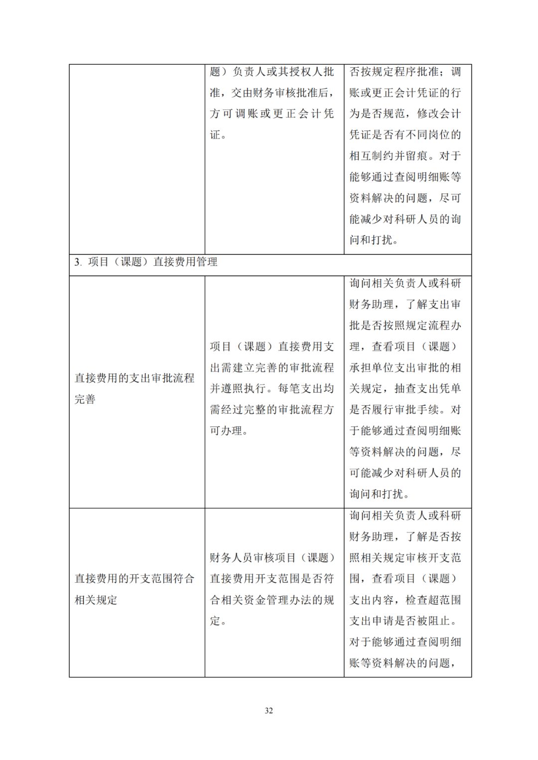 3. 根据国办发〔2021〕32 号文关于“简化预算编制”的相关要求,征求意见稿要求直接费用按设备费、业务费、劳务费三大类审计和报告科研资金支出使用情况,并增加了在审计报告中披露较大价值资产管理情况的要求。