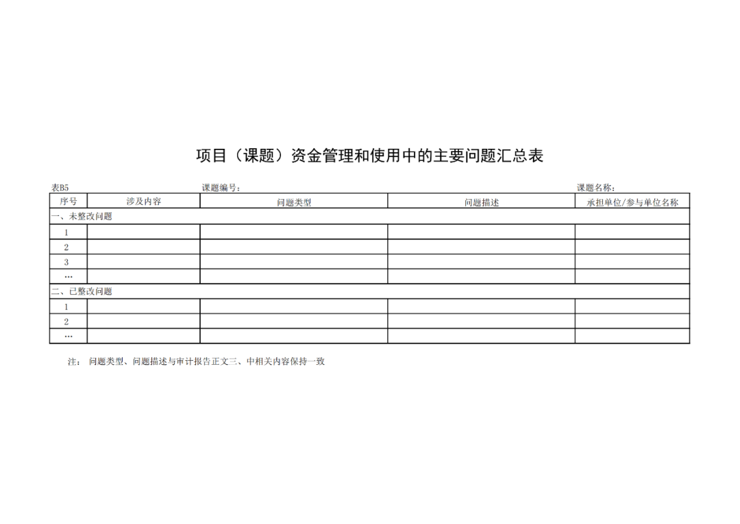 2. 简化了审计报告附表和附送资料。征求意见稿将审计报告附表缩减为5 项,其中,新设计了项目(课题)资金管理和使用中的主要问题汇总表,用于汇总展示审计报告中列示的问题。同时,征求意见稿将原有9 项审计报告附件要求简化为一项附送资料要求,即要求会计师事务所从项目(课题)承担单位、参与单位获取中央财政资金支出明细账电子版,并按照规定上传报送,不需要将纸质明细账附在审计报告后,切实减轻科研人员负担。
