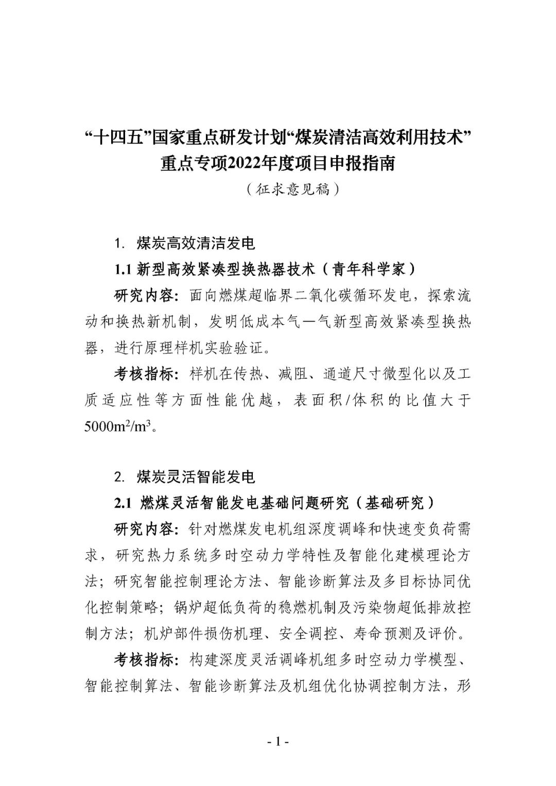 3、“煤炭清洁高效利用技术”重点专项2022年度项目申报指南(征求意见稿)