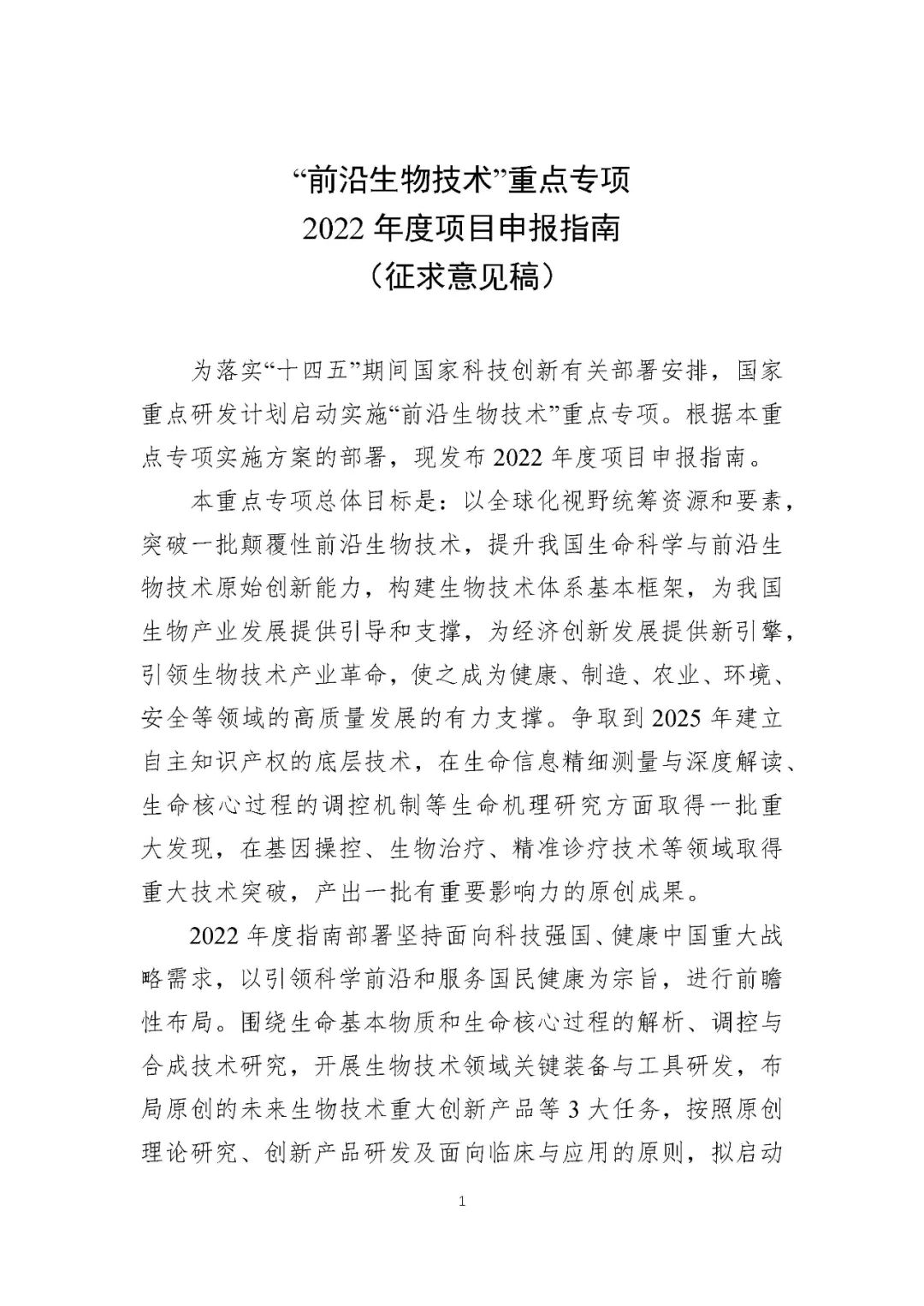 2、“前沿生物技术”重点专项2022年度项目申报指南(征求意见稿)