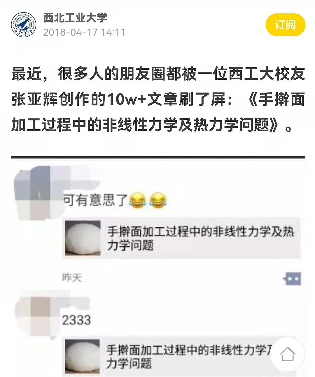 然而,单纯舌尖上的快感不足以抚慰灵魂,于是,一位叫张亚辉的同学,化食欲为生产力,写出了爆款文章《手擀面加工过程中的非线性力学及热力学问题》。