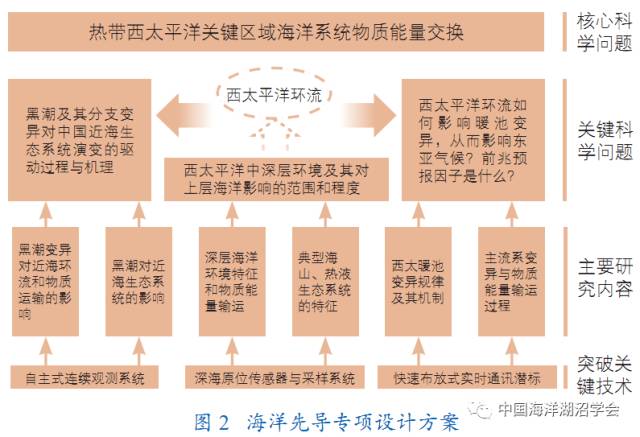 海洋科学具有大科学的特点,陆地上有的过程海洋中几乎都有;海洋学科也非常复杂,物理、化学、生物、地质无所不包,海岸带、近海、大洋、深海都很重要。但是从另一个角度看问题,不仅海洋各个部分是连在一起的,海洋各个学科也是相互关联的,例如海洋生态学的研究中,物理、化学、生物和地质环境缺一不可,所以海洋科学研究是物理海洋学、化学海洋学和生物海洋学以及海洋地质学的综合体现。我们是否能够把这几个学科结合在一起,围绕同一个问题、在同一个平台上开展研究?是否能够将大洋、深海和近海联系在一起,形成一个有机整体开展综合系统研究?什么样的题目能够表达这样的综合研究?在中科院海洋先导专项的设计中我们进行了有益的探索(图 1和图 2)。