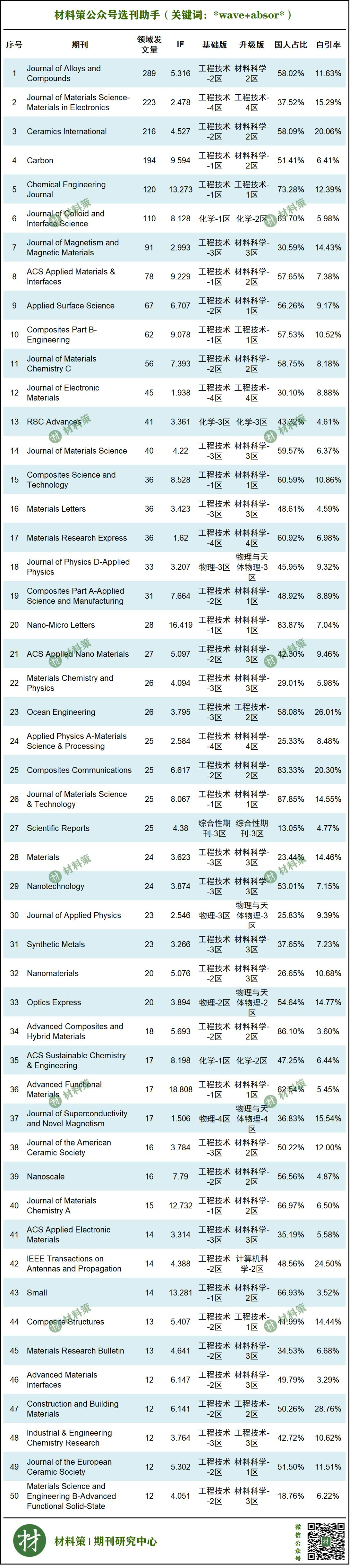 1区期刊(升级版)有10本,分别是Chemical Engineering Journal,Applied Surface Science,Composites Part B-Engineering,Composites Science and Technology,Composites Part A-Applied Science and Manufacturing,Nano-Micro Letters,Journal of Materials Science & Technology,Advanced Functional Materials,Composite Structures和Journal of the European Ceramic Society。