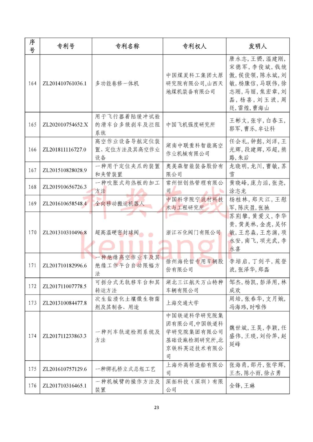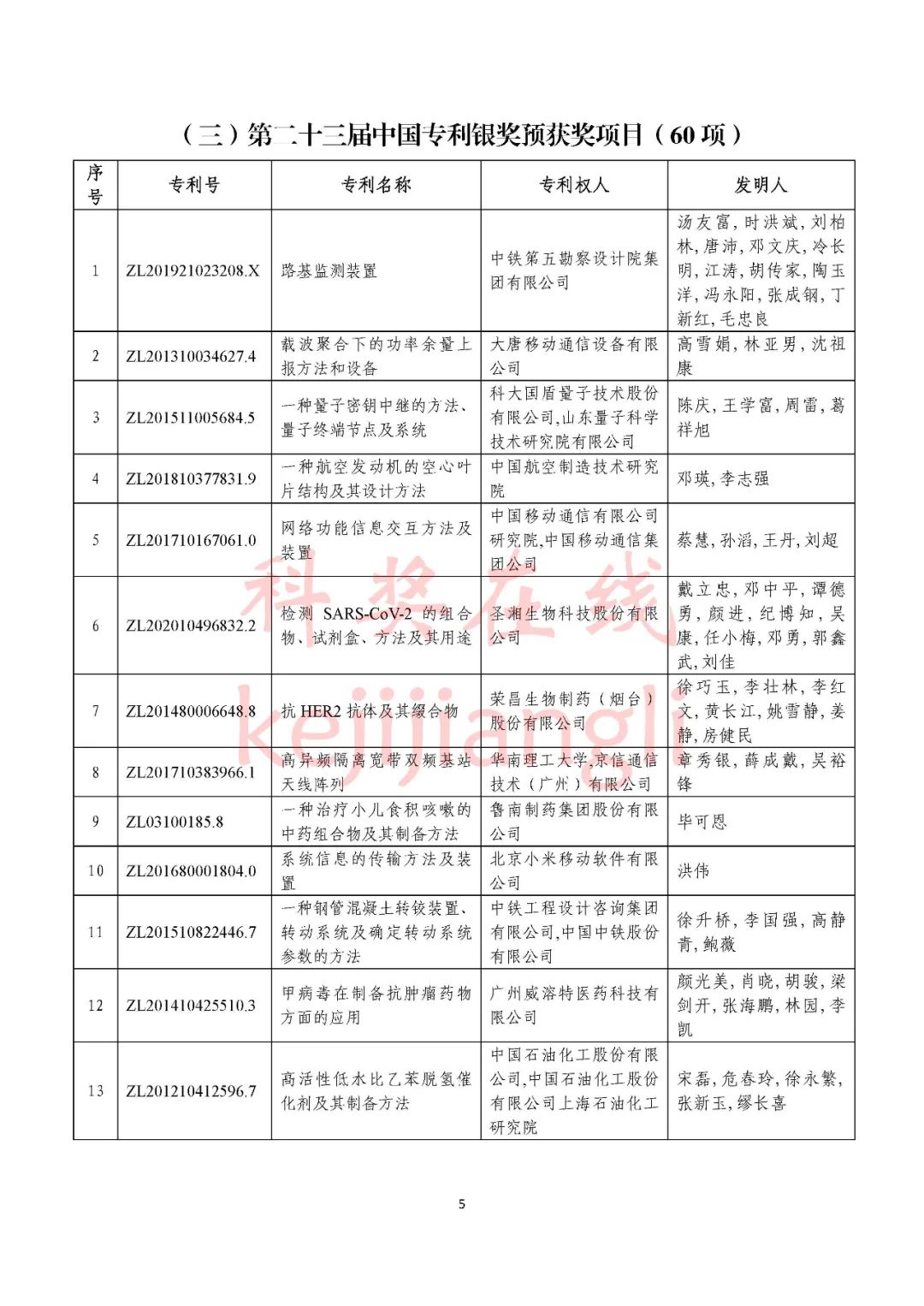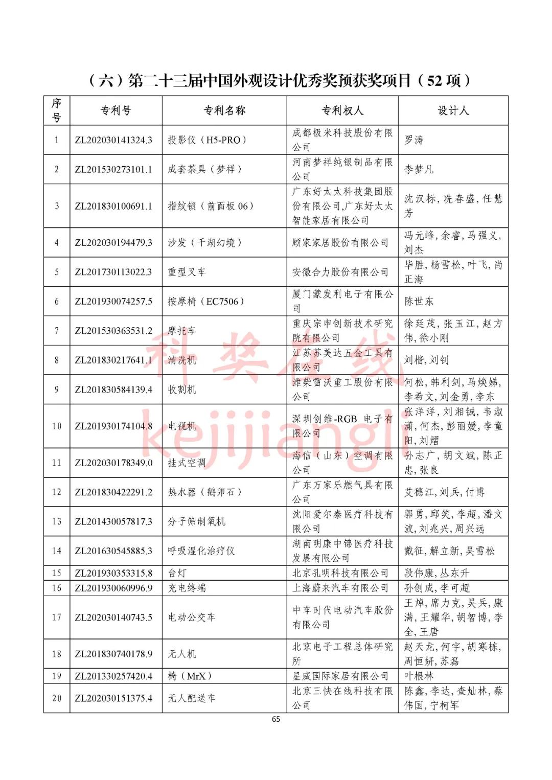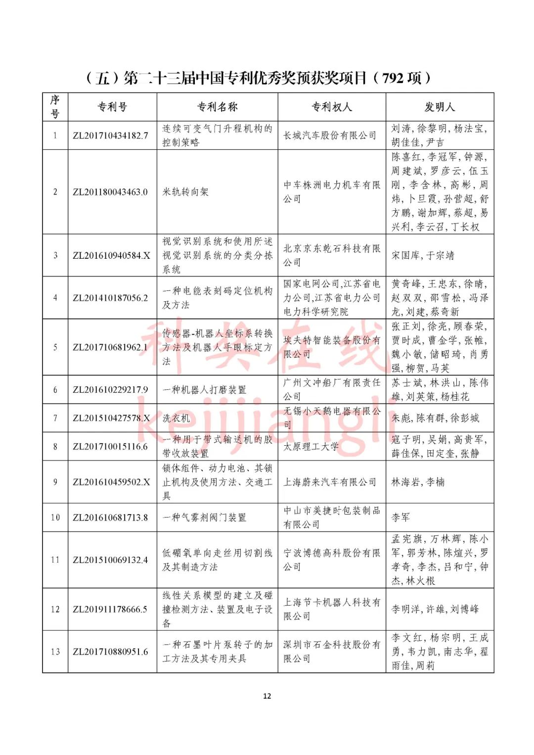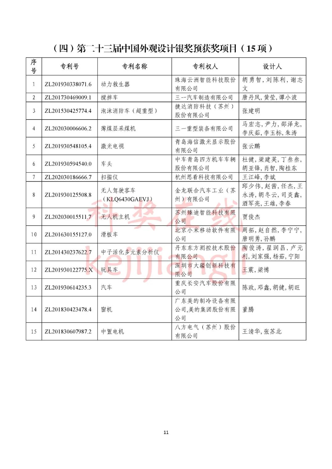 根据《中国专利奖评奖办法》《国家知识产权局关于评选第二十三届中国专利奖的通知》规定,第二十三届中国专利奖共评选出:中国专利金奖预获奖项目30项,中国外观设计金奖预获奖项目10项,中国专利银奖预获奖项目60项,中国外观设计银奖预获奖项目15项,中国专利优秀奖预获奖项目792项,中国外观设计优秀奖预获奖项目52项,现予以公示,公示期为2022年4月15日至4月21日。