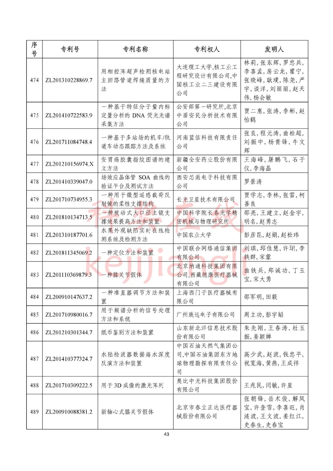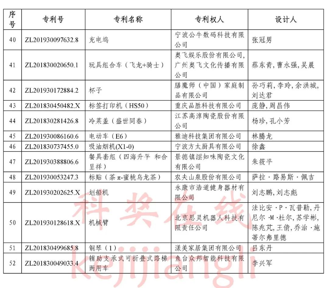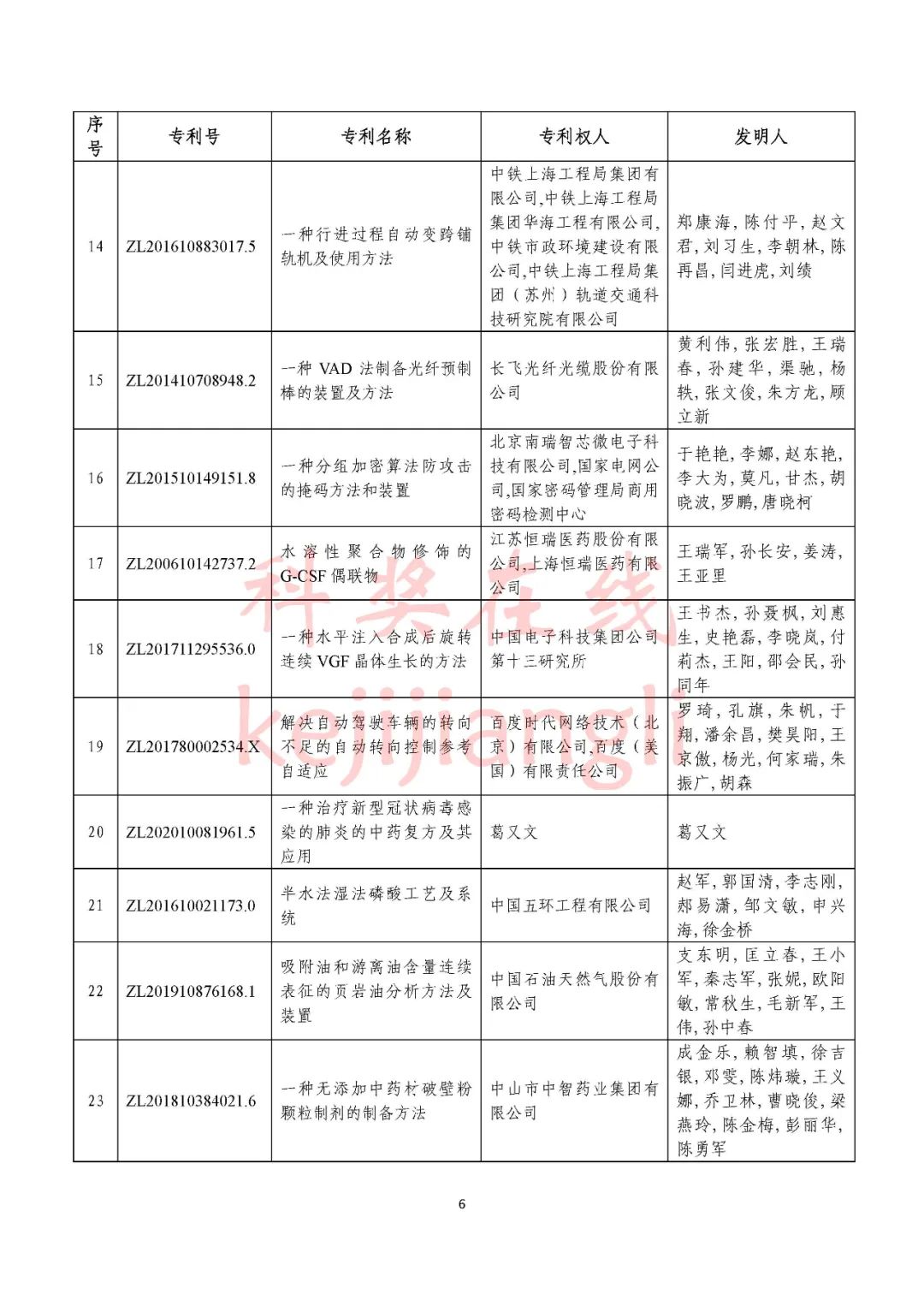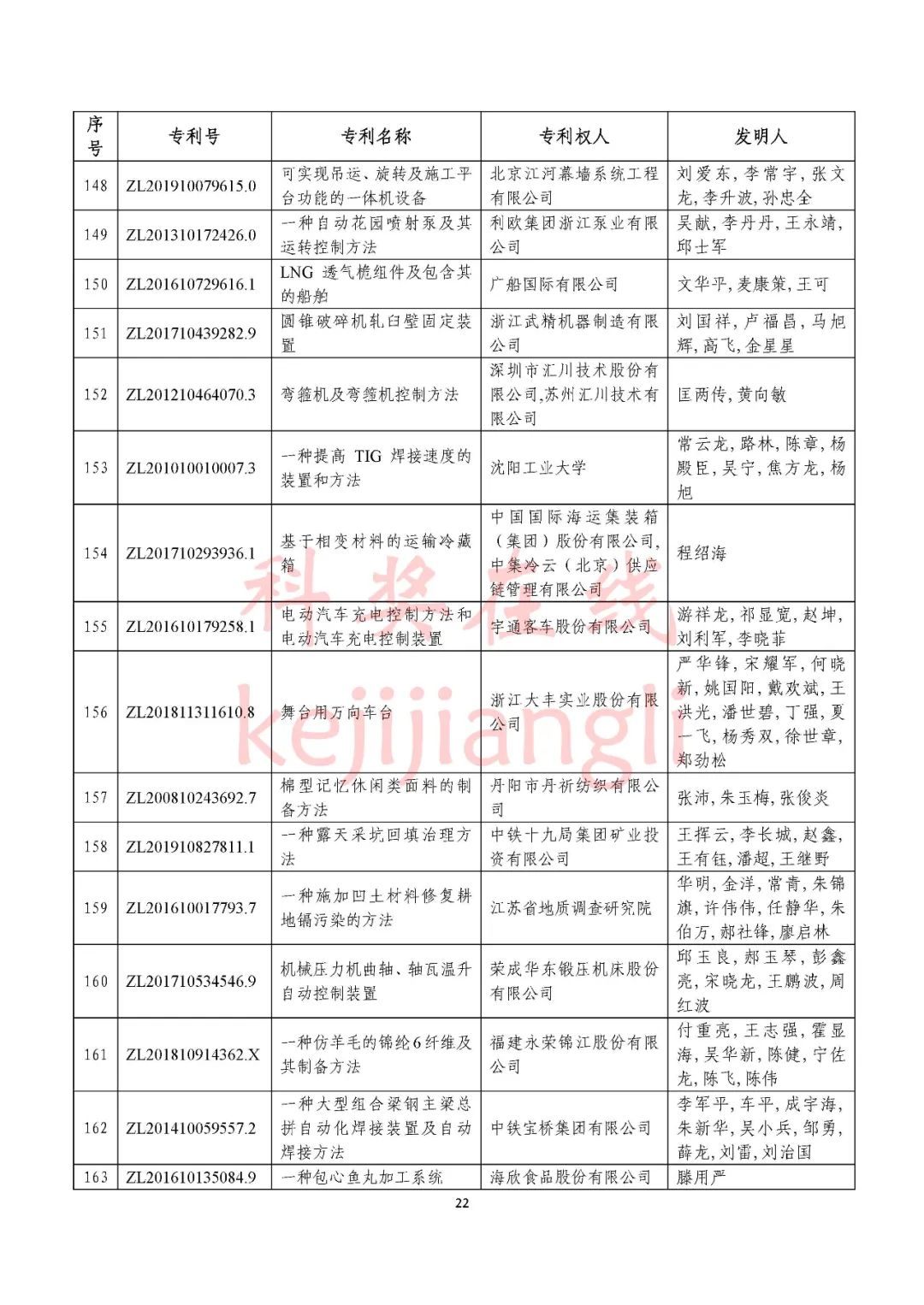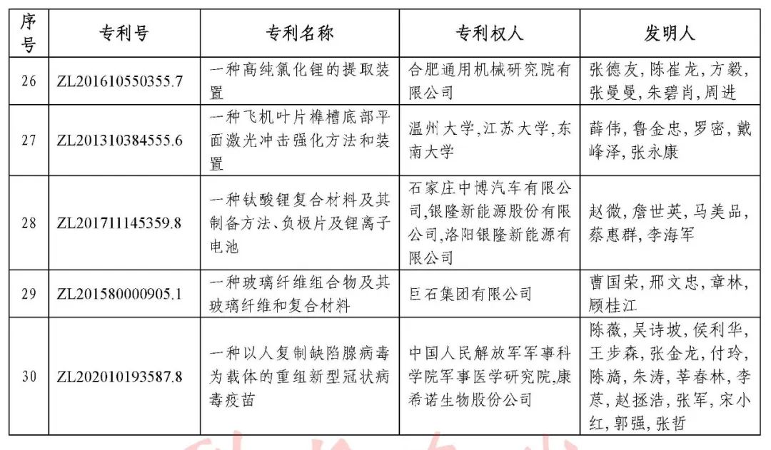 根据《中国专利奖评奖办法》《国家知识产权局关于评选第二十三届中国专利奖的通知》规定,第二十三届中国专利奖共评选出:中国专利金奖预获奖项目30项,中国外观设计金奖预获奖项目10项,中国专利银奖预获奖项目60项,中国外观设计银奖预获奖项目15项,中国专利优秀奖预获奖项目792项,中国外观设计优秀奖预获奖项目52项,现予以公示,公示期为2022年4月15日至4月21日。