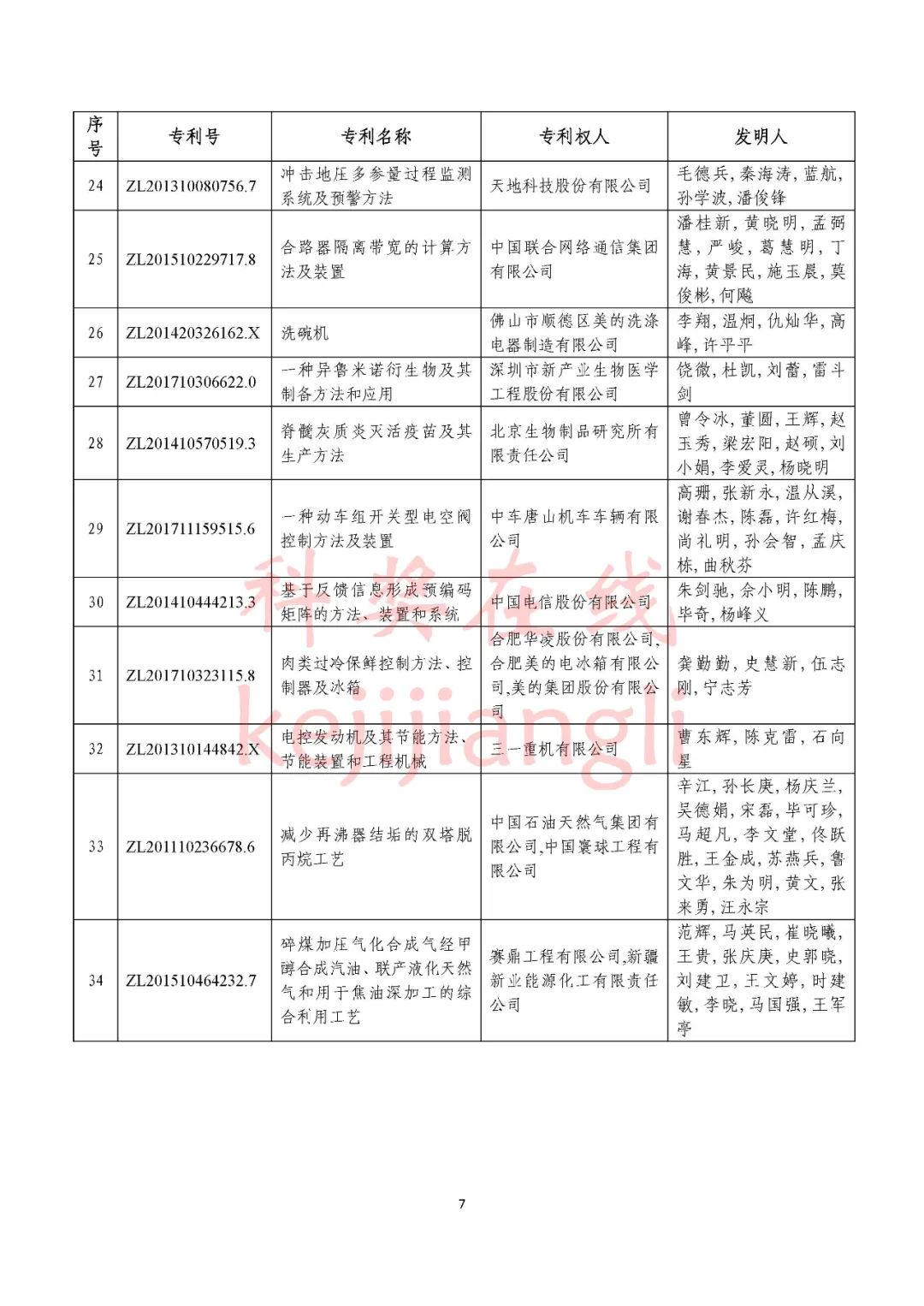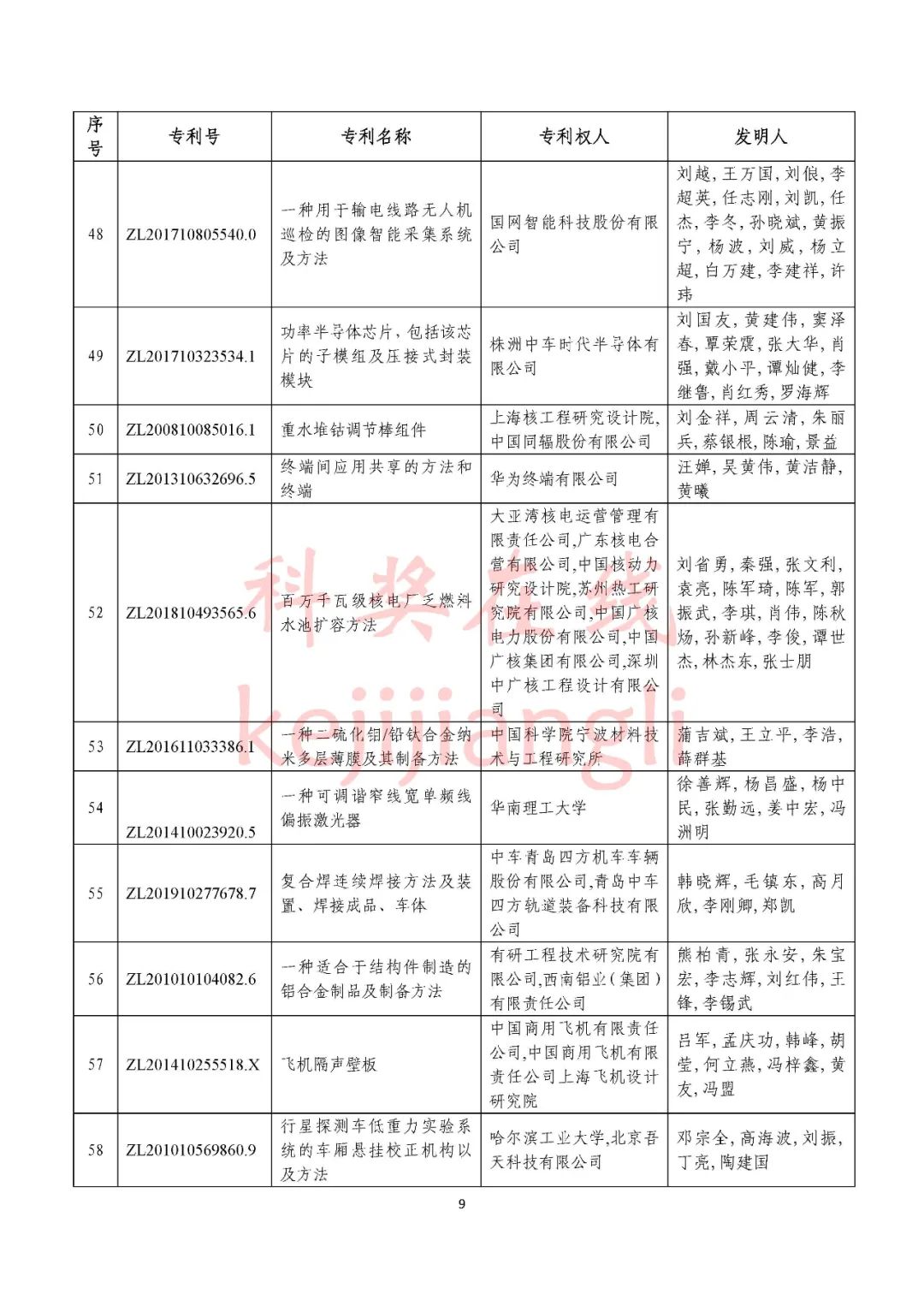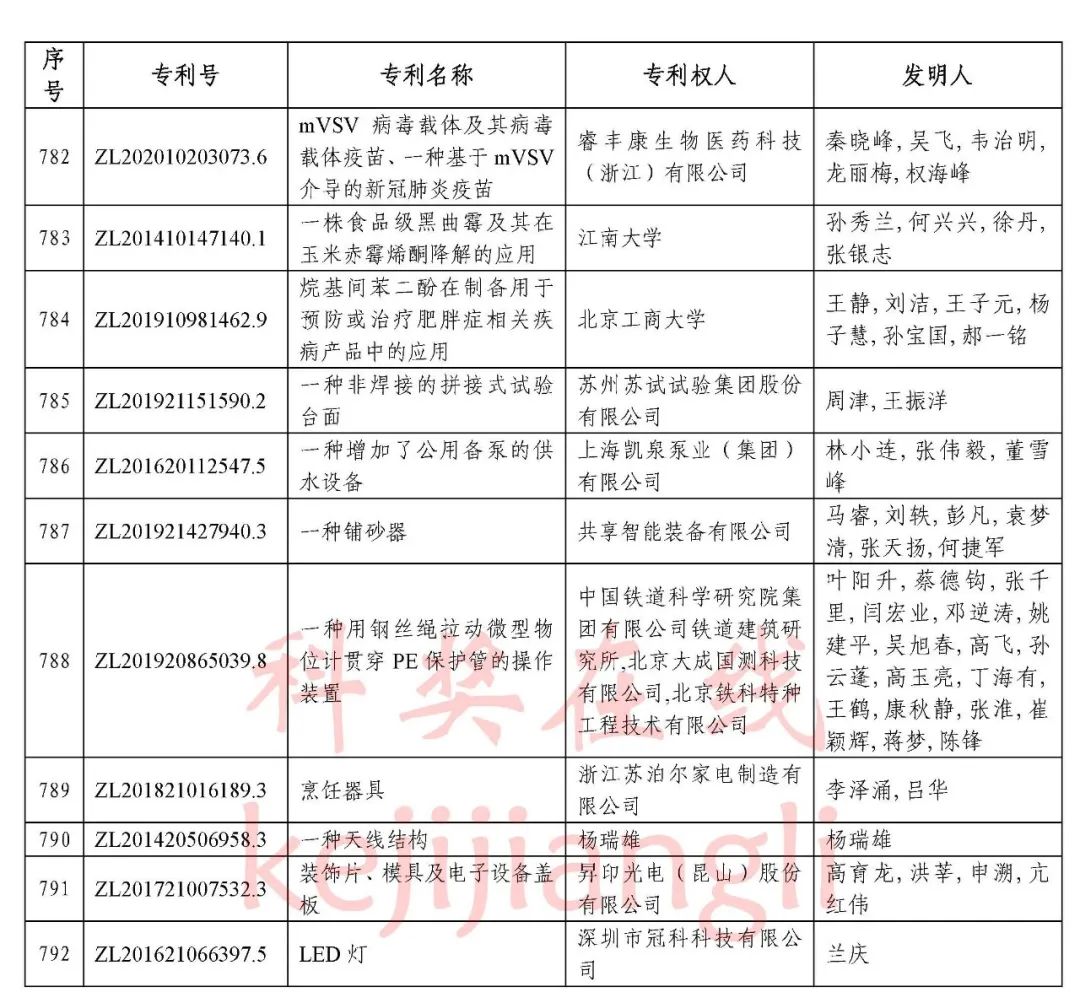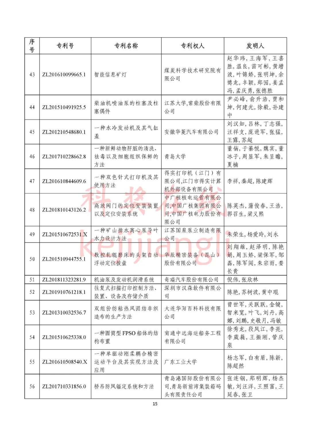 根据《中国专利奖评奖办法》《国家知识产权局关于评选第二十三届中国专利奖的通知》规定,第二十三届中国专利奖共评选出:中国专利金奖预获奖项目30项,中国外观设计金奖预获奖项目10项,中国专利银奖预获奖项目60项,中国外观设计银奖预获奖项目15项,中国专利优秀奖预获奖项目792项,中国外观设计优秀奖预获奖项目52项,现予以公示,公示期为2022年4月15日至4月21日。