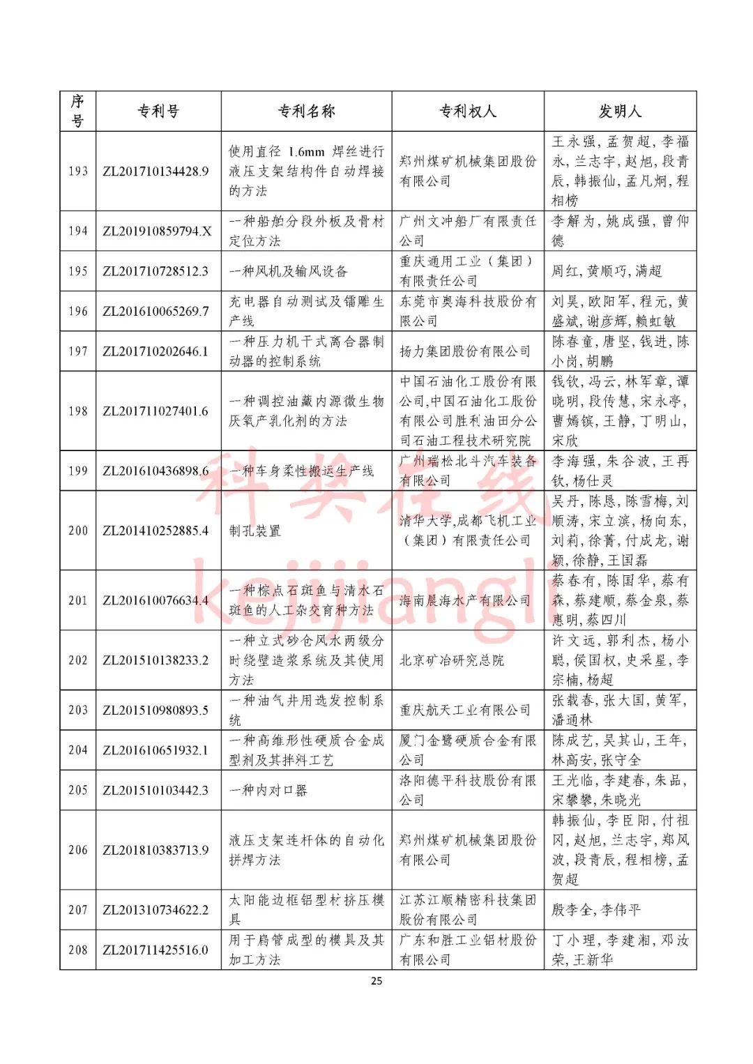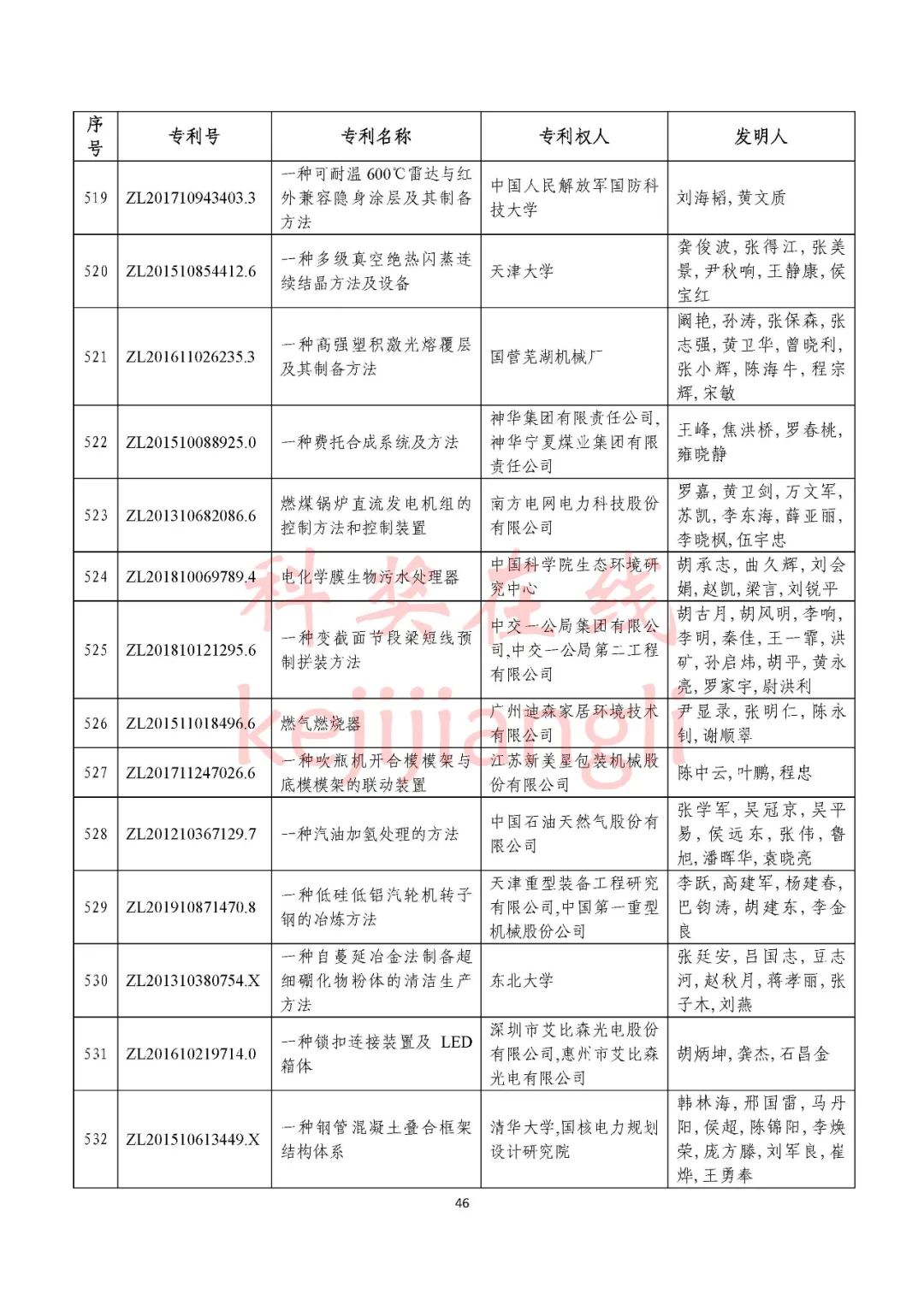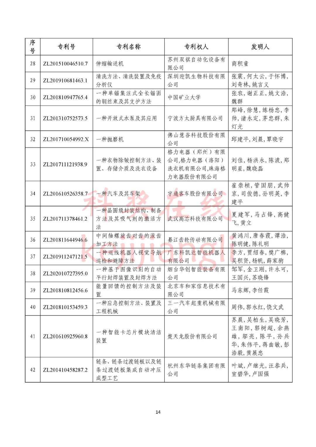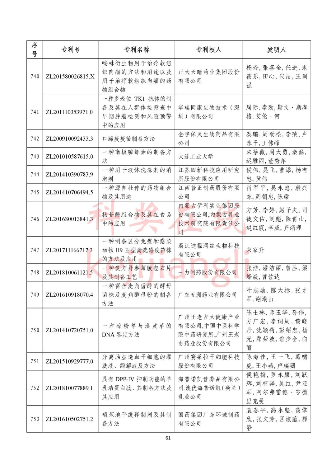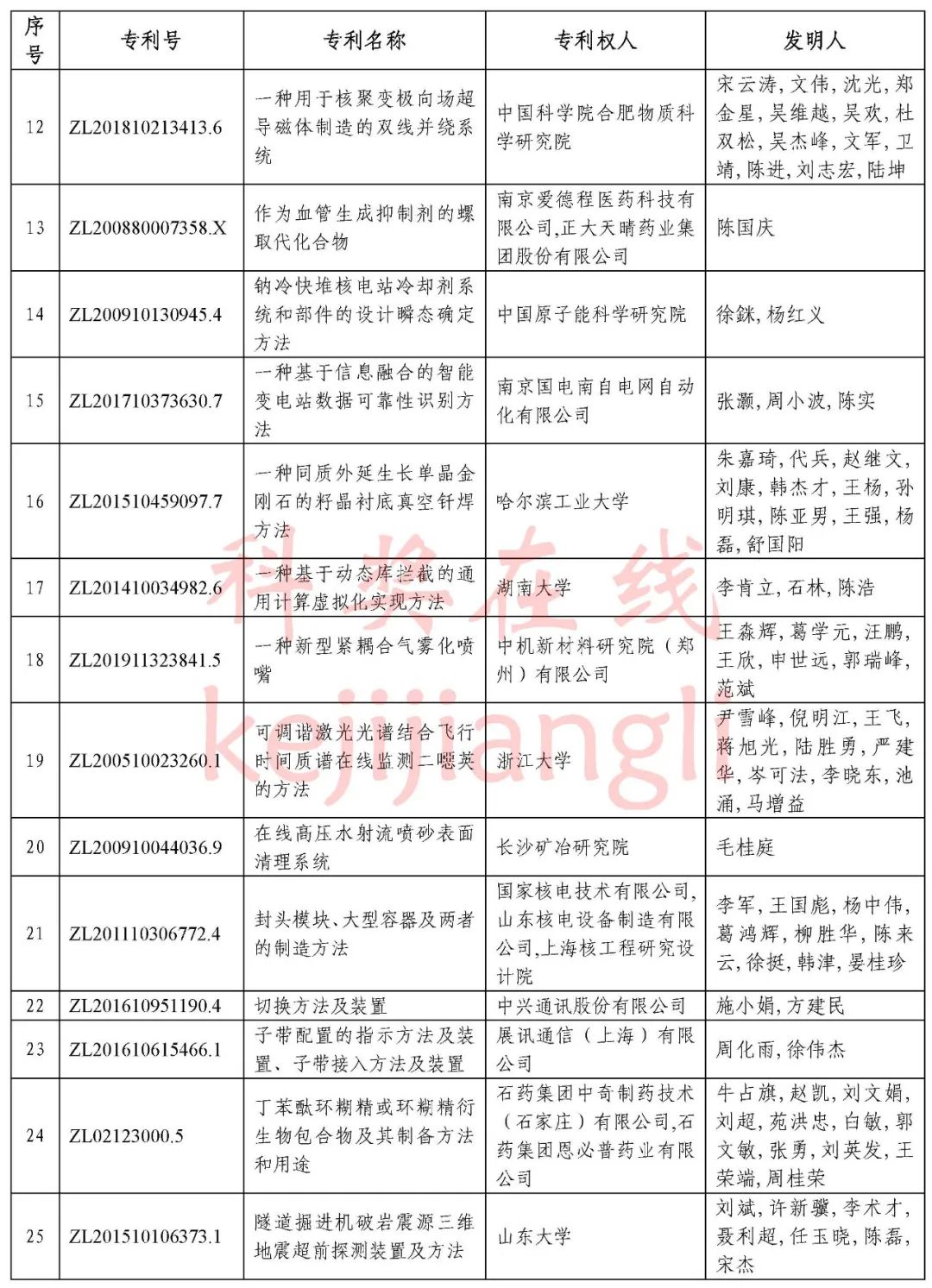 根据《中国专利奖评奖办法》《国家知识产权局关于评选第二十三届中国专利奖的通知》规定,第二十三届中国专利奖共评选出:中国专利金奖预获奖项目30项,中国外观设计金奖预获奖项目10项,中国专利银奖预获奖项目60项,中国外观设计银奖预获奖项目15项,中国专利优秀奖预获奖项目792项,中国外观设计优秀奖预获奖项目52项,现予以公示,公示期为2022年4月15日至4月21日。