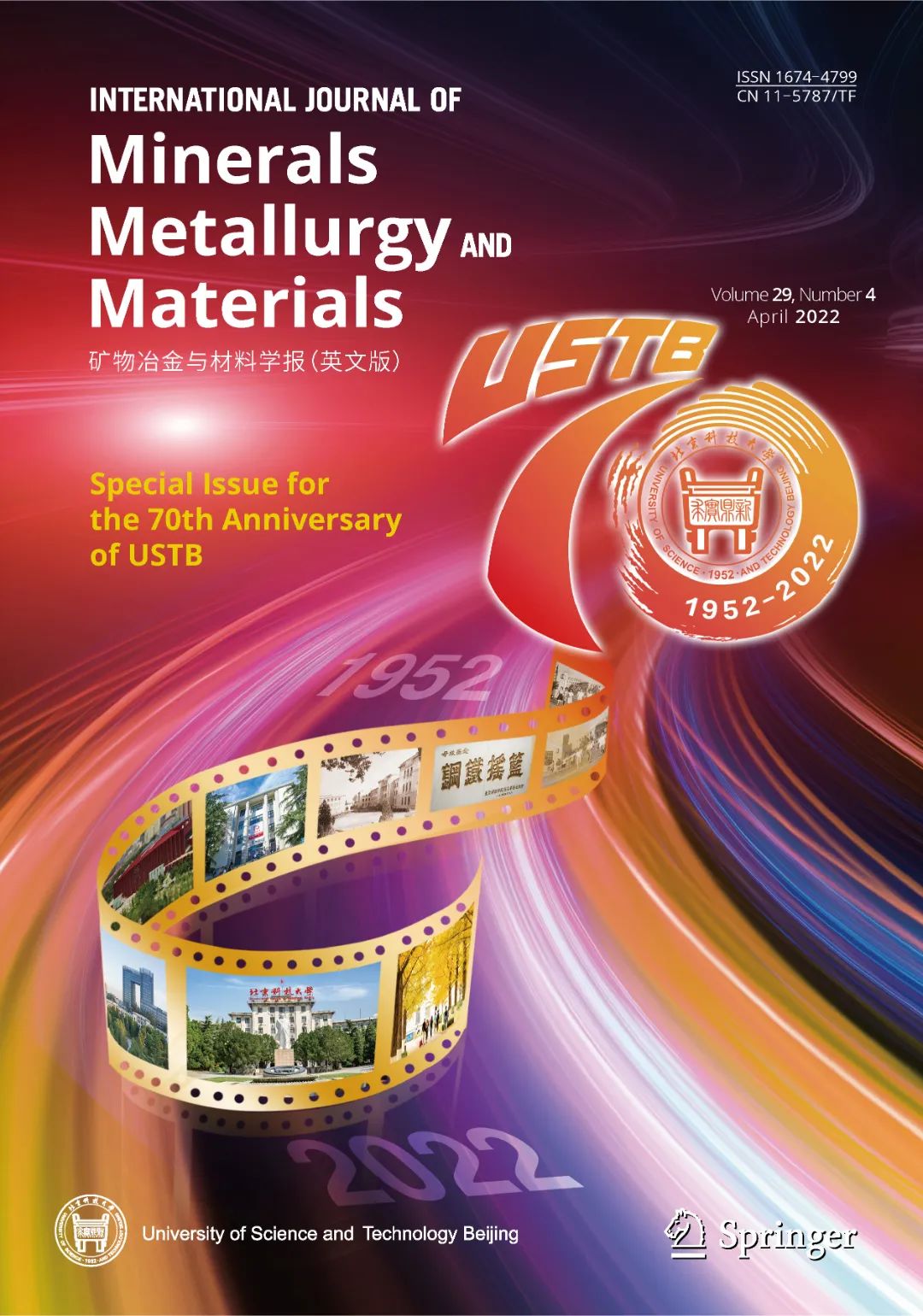 为了隆重庆祝北京科技大学建校70周年,《矿物冶金与材料学报(英文版)》组织出版了“庆祝北京科技大学建校70 周年特刊”,邀请了全球矿物、冶金、材料行业院士/高水平学者就相关领域的发展前沿、研究现状、技术挑战、创新成果与未来展望进行研究和综述。中国科学院院士徐冠华教授为特刊作序。特刊包括论文28篇,其中17篇综述类论文,11篇原始研究论文;11篇来自于国内外院士团队,8篇来自于日本、英国、美国、比利时、瑞典的院士团队和国际著名学者,11篇来自国内著名学者。这些论文全方位、立体化展现了碳中和与碳达峰、机器学习、腐蚀大数据、智能矿冶技术、纳米气泡浮选、绿色与可持续冶金、先进金属材料、功能材料和新型能源材料等前沿领域的科技创新的重要成就和重大进展,与广大的科研工作者、期刊的读者和作者们共同见证北京科技大学70年从成长到壮大的辉煌历程。