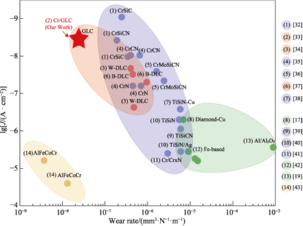 碳基涂层主要指由金刚石相sp3和石墨相sp2杂化键组成的一大类非晶碳材料,其力学、摩擦学和化学惰性非常优异,且可由多种低温PVD方法大面积均匀制备,基体适用广。目前,如何进一步提高PVD碳基涂层的结构致密性,突破涂层强韧多功能防护协同,获得多种基体表面的强牢靠膜基结合,被认为是实现碳基涂层长寿命抗磨蚀防护服役的共性科学技术挑战。通过引入过渡层、掺杂金属或非金属元素、制备多层复合结构,是解决上述问题的主要途径。