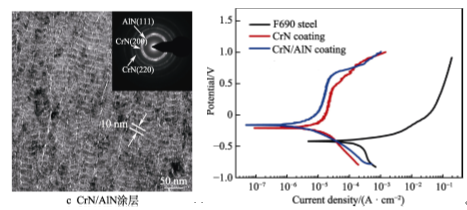 CrN/AlN涂层截面TEM及其与基体和单一CrN涂层在海水中摩擦极化曲线对比