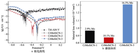 海水中不同Mo含量CrMoSiCN涂层的极化曲线和磨损体积