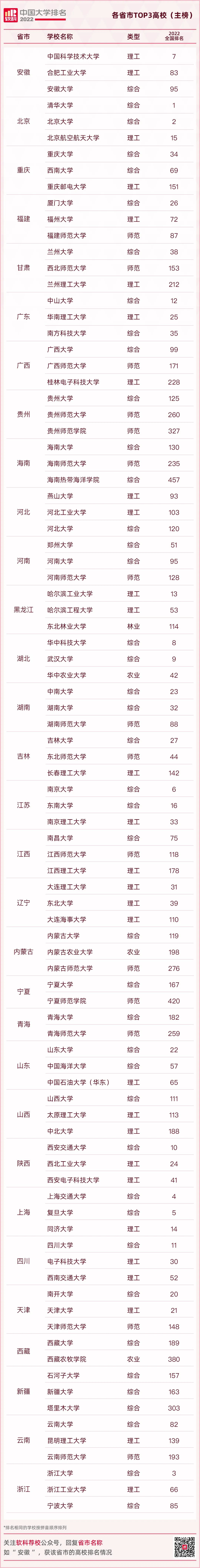 4月19日,高等教育专业评价机构软科正式发布2022软科中国大学排名,对中国内地1000多所本科层次高校进行了客观、专业的评价。对各地读者来说,最关注的除了今年的整体排名之外,一定是本省市的高校排名情况。本地高校谁摘得桂冠位居第1;谁又堪称本地高校排头兵,名列三甲? 本省市的其他高校又排名如何?围绕这些问题,本文从2022软科中国大学排名主榜中提取各省市Top 3高校的情况,并将提供分省排名详情,供读者参考。