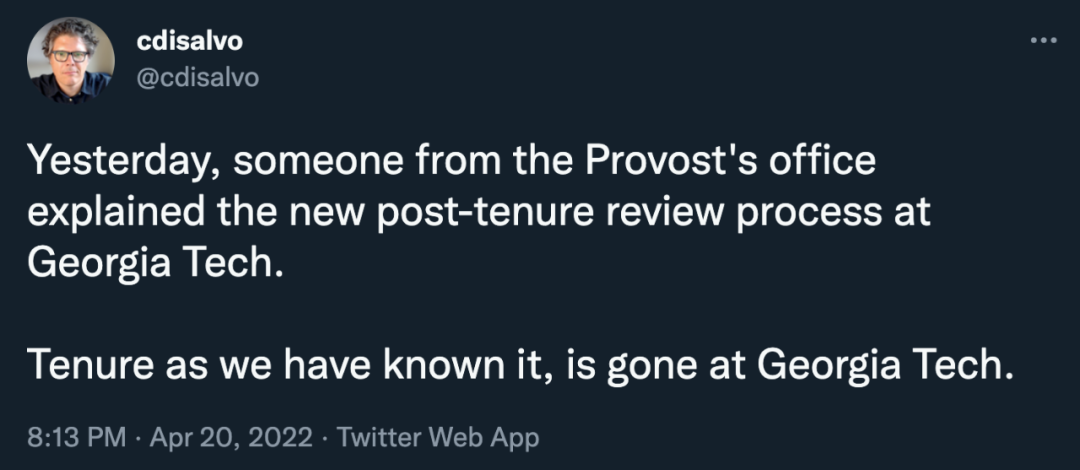 「昨天,教务长办公室的人阐述了佐治亚理工学院新的任期后审查程序。我们所知道的任期制度,在佐治亚理工学院已经消失了。」