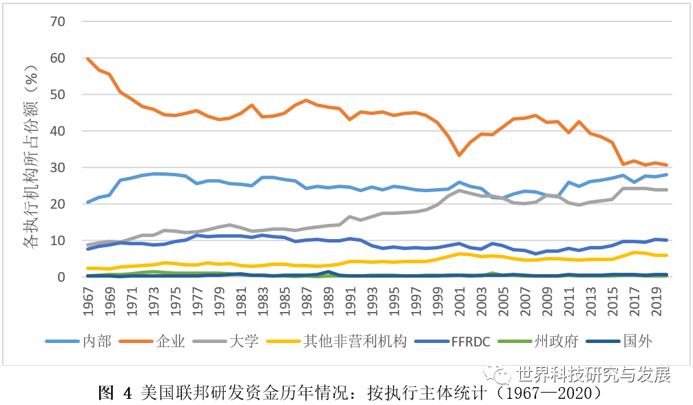 实际上,美国联邦资金在不同执行主体间的分配一直在变化(图4)。给予企业的资金占美国联邦研发资金的比例逐年降低,从1967年的60%降至2019年的30%左右;给予大学的资金所占比例不断增加,从1967年的不足10%增至近25%;用于政府研发机构的研发资金所占比例一直在25%上下浮动;给予FFRDC的资金所占比例一直在10%上下浮动;给予非营利机构的资金略有增加,从1967年的2.4%增至2019年的6%左右。这种变化趋势与美国联邦资金所资助的研发活动类型的变化趋势一致:随着基础研究在联邦研发资金中所占份额的不断增加,基础研究的主要执行者——大学所获得的联邦研发资金所占份额不断增加;与此同时,随着试验发展在联邦研发资金中所占份额的不断降低,试验发展的主要执行者——企业所获得的联邦研发资金所占份额也在不断减少。