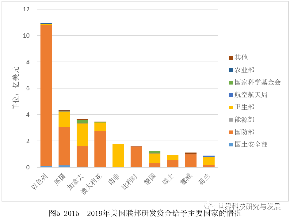 美国联邦给予我国机构执行的研发资金很少,五年合计1.49亿美元,仅占美国联邦外拨国外研发资金的0.3%,低于很多发展中国家,都是由美国卫生部提供的。