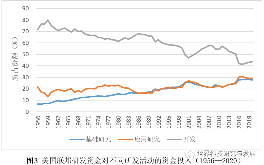 尽管美国联邦研发资金当前主要资助研究活动,但几十年前,其绝大部分资金却用于资助试验发展活动(图3)。1956年,美国联邦研发资金的70%以上用于试验发展,当时用于资助基础研究的份额不足7%,应用研究所占份额不足22%。随着美国科技能力和水平的不断提升,企业的科技创新能力和研发投资不断增加,美国联邦政府研发资助的侧重点逐渐从试验发展向基础研究和应用研究倾斜,基础研究所占份额稳步提升,试验发展所占的份额稳步下降。到2015年,美国联邦研发资金中用于研究(包括基础研究和应用研究)的份额追上试验发展所占的份额,到2020年,此数值超过了55%。