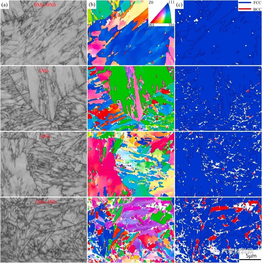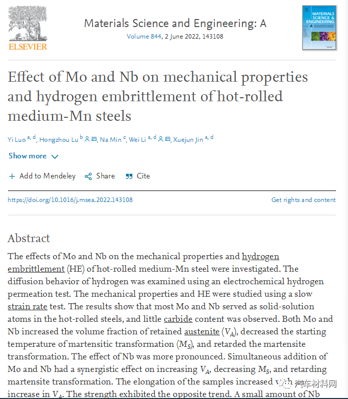 我们和中信金属、上海大学合作,研究了Nb、Mo微合金化对热轧中锰钢力学性能和氢脆的影响。结果表明,Nb、Mo在热轧钢中以固溶体形式存在,碳化物含量很少。Mo和Nb均增加了残余奥氏体的体积分数(VA),降低了马氏体相变的起始温度(MS),延缓了马氏体相变,其中Nb的作用更为明显。同时添加Mo和Nb对增加VA、降低MS和延缓马氏体转变具有协同效应。