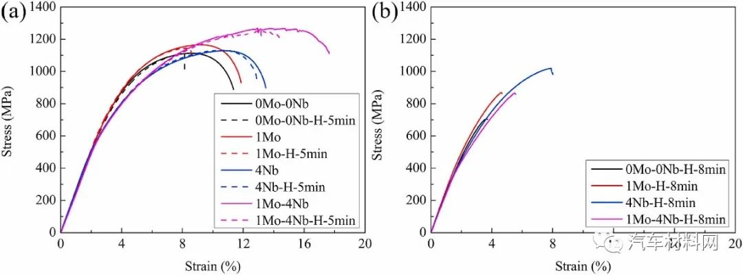 图3.(a)未充氢和充氢5min(20mAcm-2)的试样的慢速率拉伸曲线(b)充氢8分钟(20mAcm-2)的试样的慢速率拉伸曲线