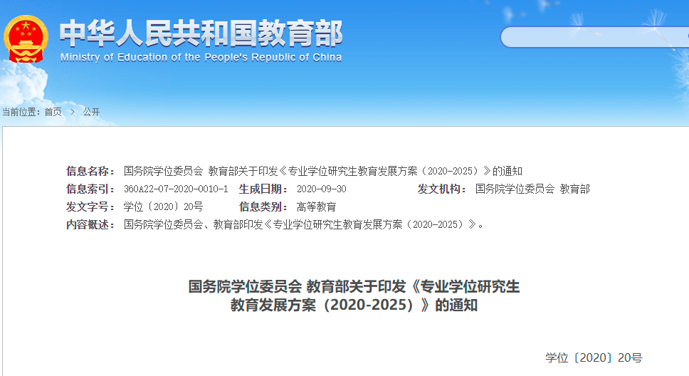 2020年9月,教育部发布了《关于加快新时代研究生教育改革发展的意见》,明确指出在扩大硕士招生规模的基础上,“新增硕士学位授权点以专业学位授权点为主”。同月,国务院学位委员会和教育部联合发布《专业学位研究生教育发展方案(2020-2025)》,其中明确指出,到2025年,以国家重大战略、关键领域和社会重大需求为重点,增设一批硕士、博士专业学位类别,将硕士专业学位研究生招生规模扩大到硕士研究生招生总规模的三分之二左右,大幅增加博士专业学位研究生招生数量。