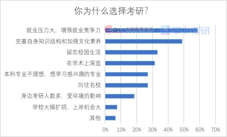 《2022年全国研究生招生调查报告》在针对考研动机的调查分析中提到,就业压力成为考生选择考研的最主要因素,近六成的考生因为就业压力大,想增强就业竞争力而选择考研;选择在学术上深造的考生占比刚刚超过三成。