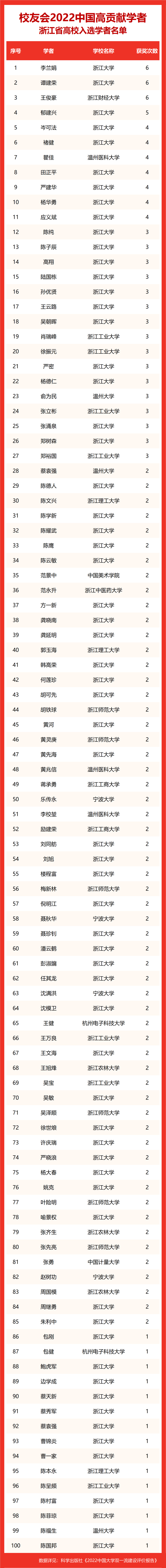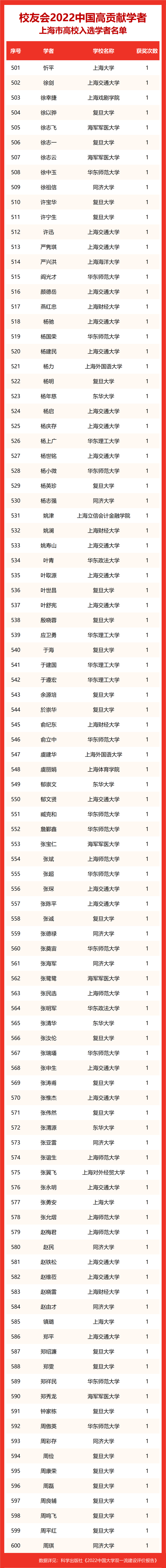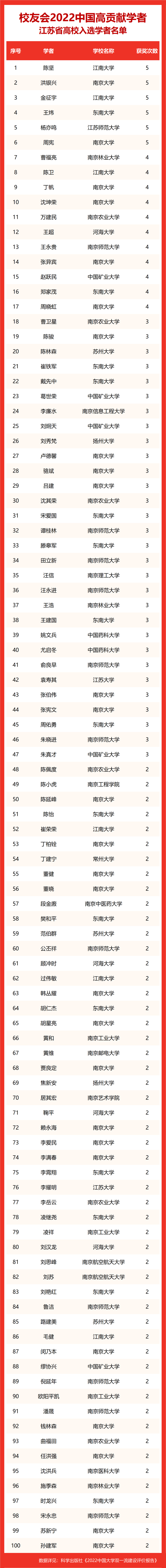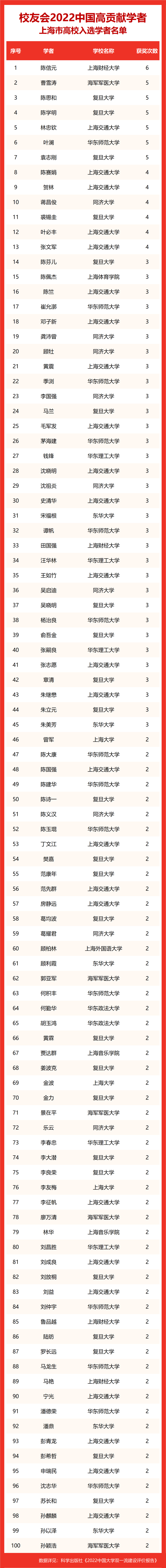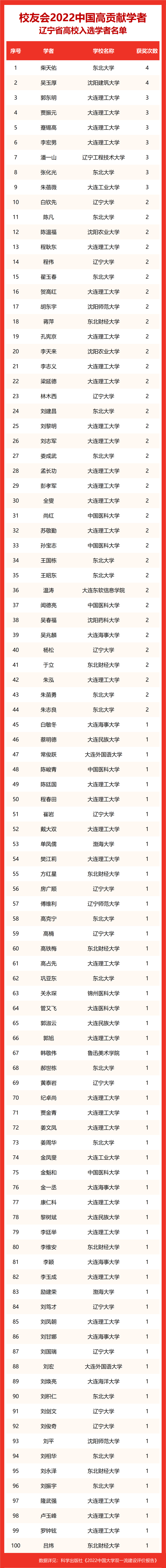 校友会2022中国高贡献学者遴选突出评价学者的教育教学水平、学术研究水平、创新质量和实际社会贡献,选择国家教学成果奖、国家科学技术奖励、教育部人文社会科学奖励、中宣部五个一工程奖、中国专利奖等12项社会各界公认权威主流、具有标志性代表性的指标作为评价标准,遴选标准科学客观统一,指标统计时间为2000-2021年。