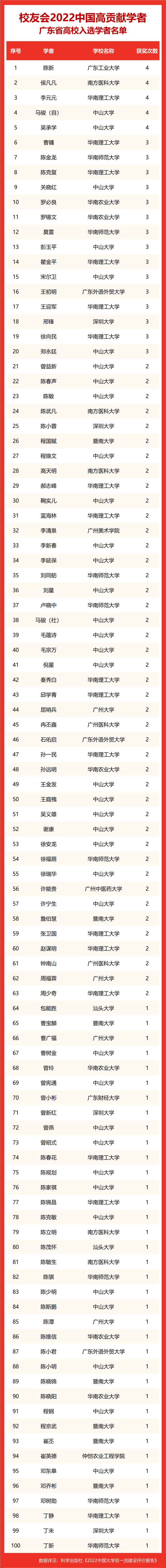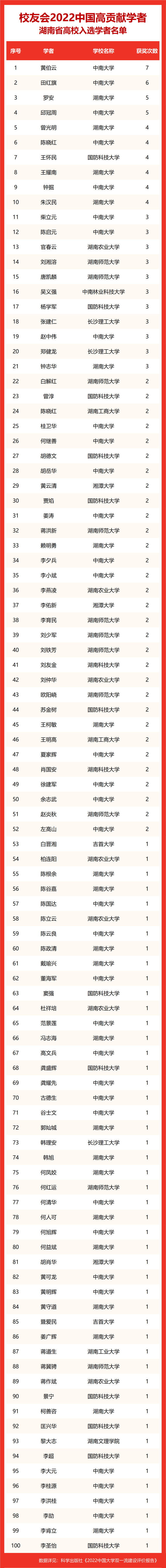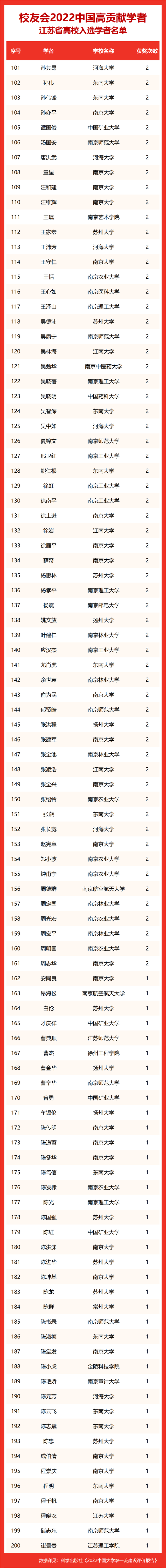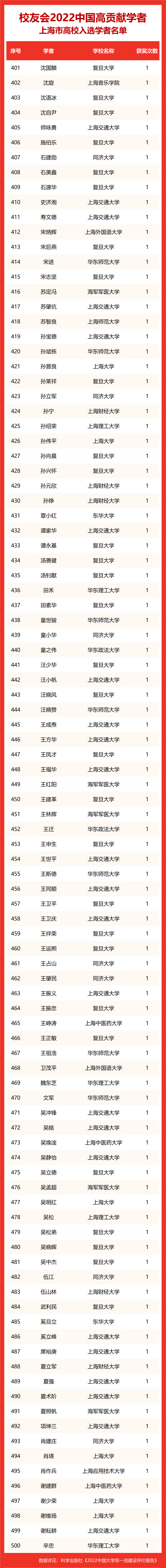 校友会2022中国高贡献学者遴选突出评价学者的教育教学水平、学术研究水平、创新质量和实际社会贡献,选择国家教学成果奖、国家科学技术奖励、教育部人文社会科学奖励、中宣部五个一工程奖、中国专利奖等12项社会各界公认权威主流、具有标志性代表性的指标作为评价标准,遴选标准科学客观统一,指标统计时间为2000-2021年。