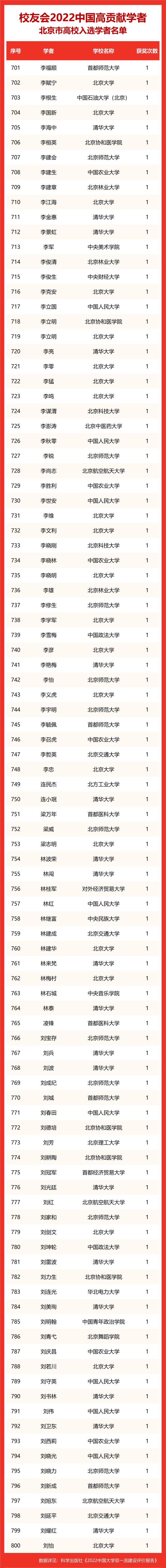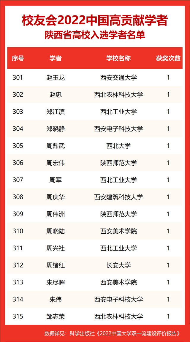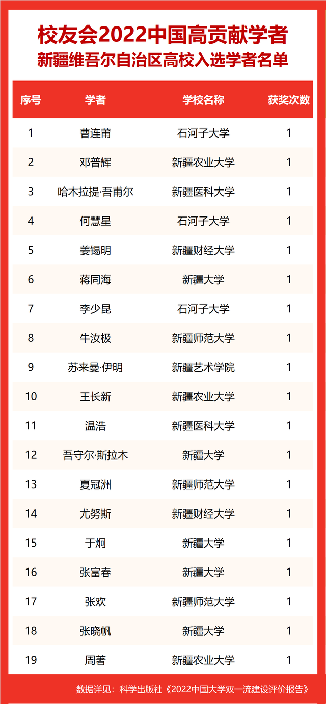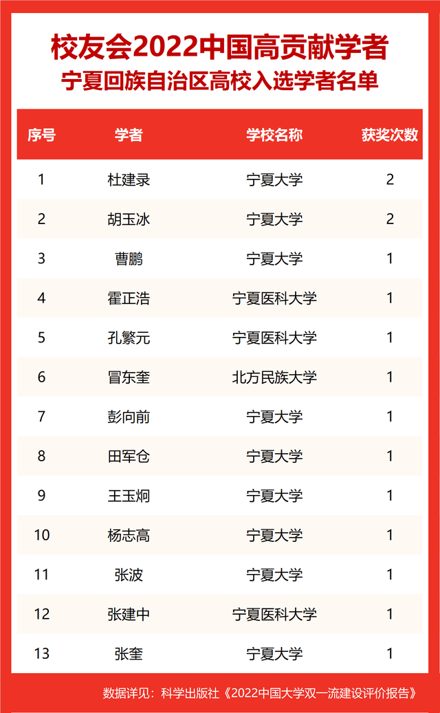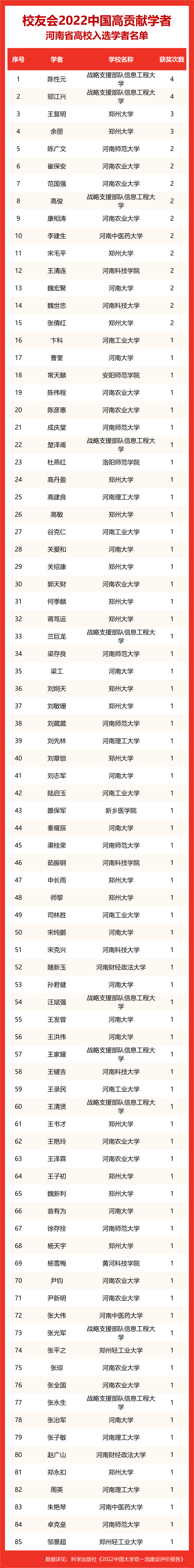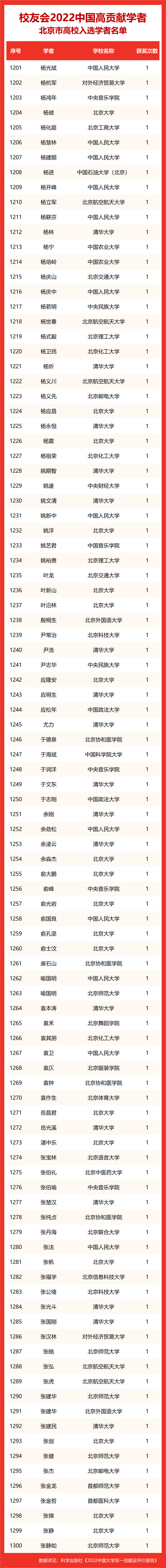 校友会2022中国高贡献学者遴选突出评价学者的教育教学水平、学术研究水平、创新质量和实际社会贡献,选择国家教学成果奖、国家科学技术奖励、教育部人文社会科学奖励、中宣部五个一工程奖、中国专利奖等12项社会各界公认权威主流、具有标志性代表性的指标作为评价标准,遴选标准科学客观统一,指标统计时间为2000-2021年。