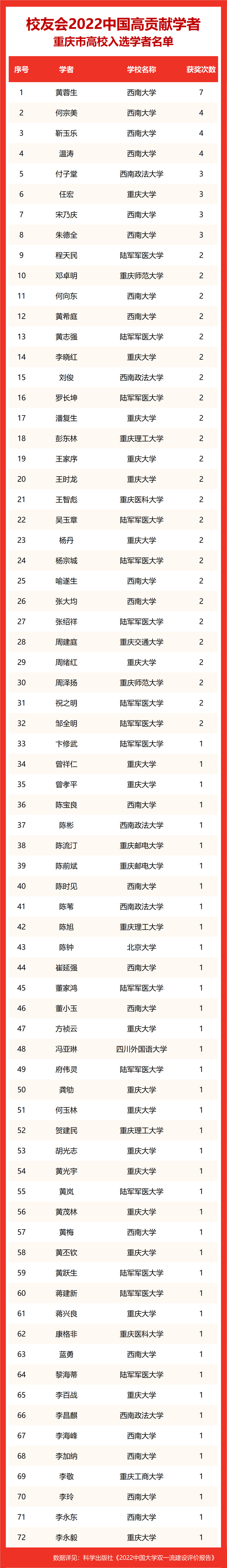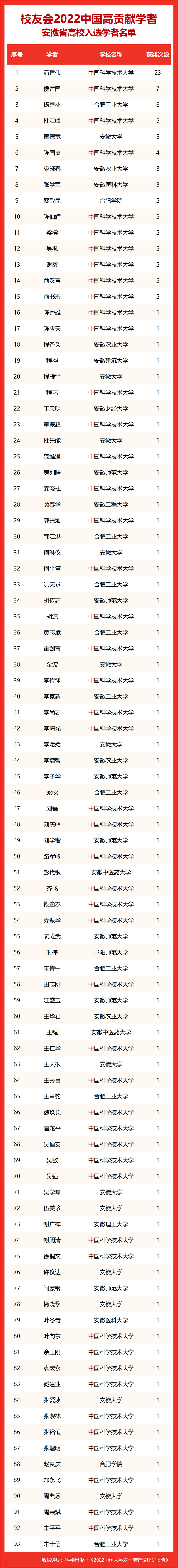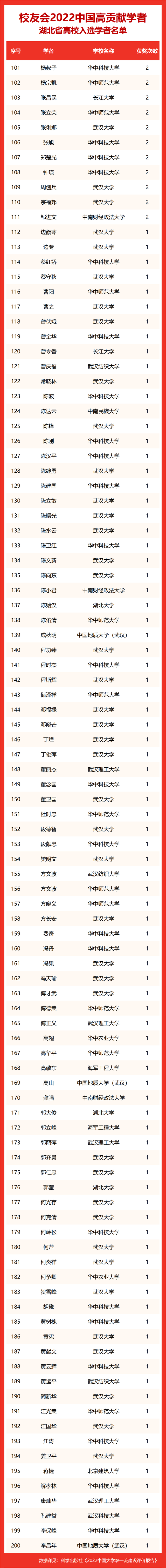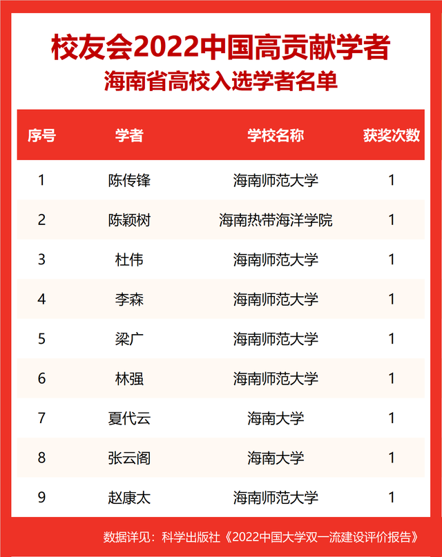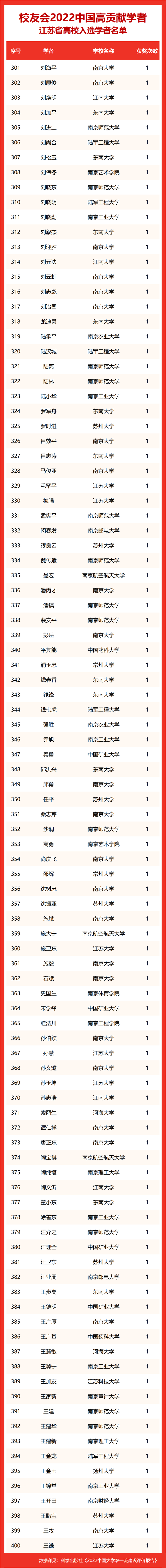 校友会2022中国高贡献学者遴选突出评价学者的教育教学水平、学术研究水平、创新质量和实际社会贡献,选择国家教学成果奖、国家科学技术奖励、教育部人文社会科学奖励、中宣部五个一工程奖、中国专利奖等12项社会各界公认权威主流、具有标志性代表性的指标作为评价标准,遴选标准科学客观统一,指标统计时间为2000-2021年。