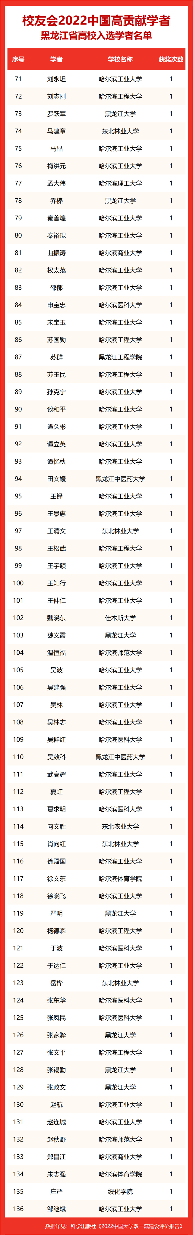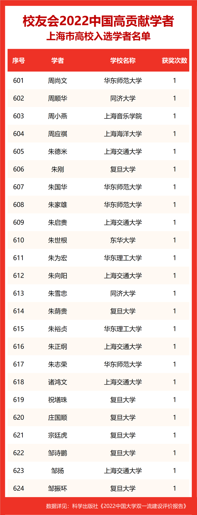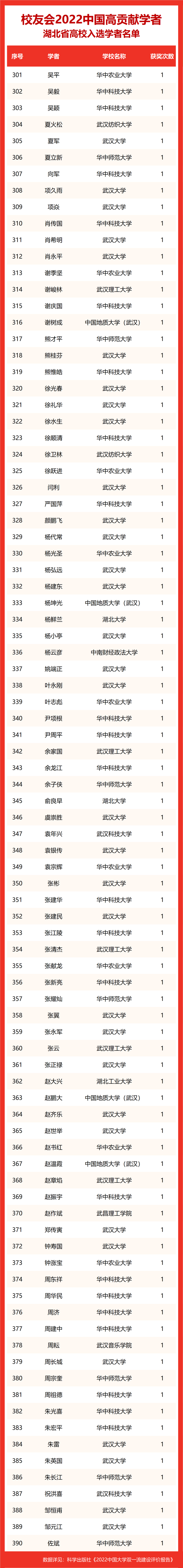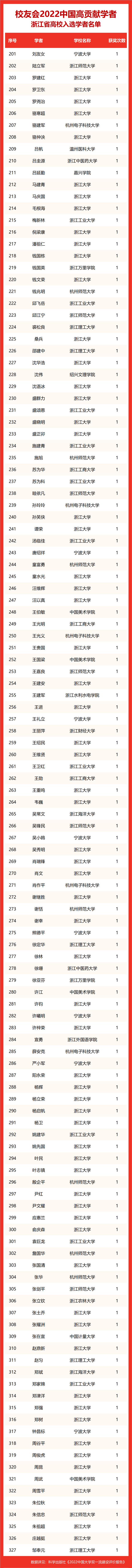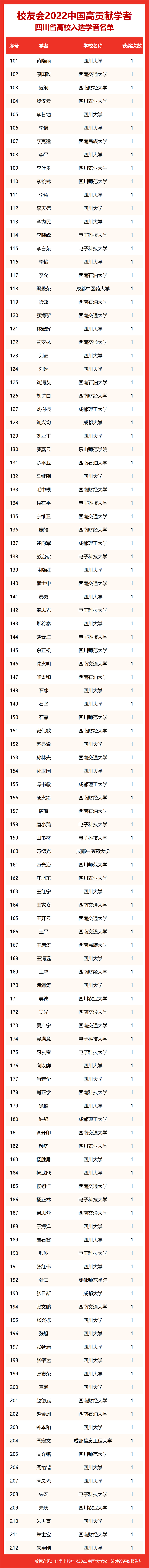 校友会2022中国高贡献学者遴选突出评价学者的教育教学水平、学术研究水平、创新质量和实际社会贡献,选择国家教学成果奖、国家科学技术奖励、教育部人文社会科学奖励、中宣部五个一工程奖、中国专利奖等12项社会各界公认权威主流、具有标志性代表性的指标作为评价标准,遴选标准科学客观统一,指标统计时间为2000-2021年。
